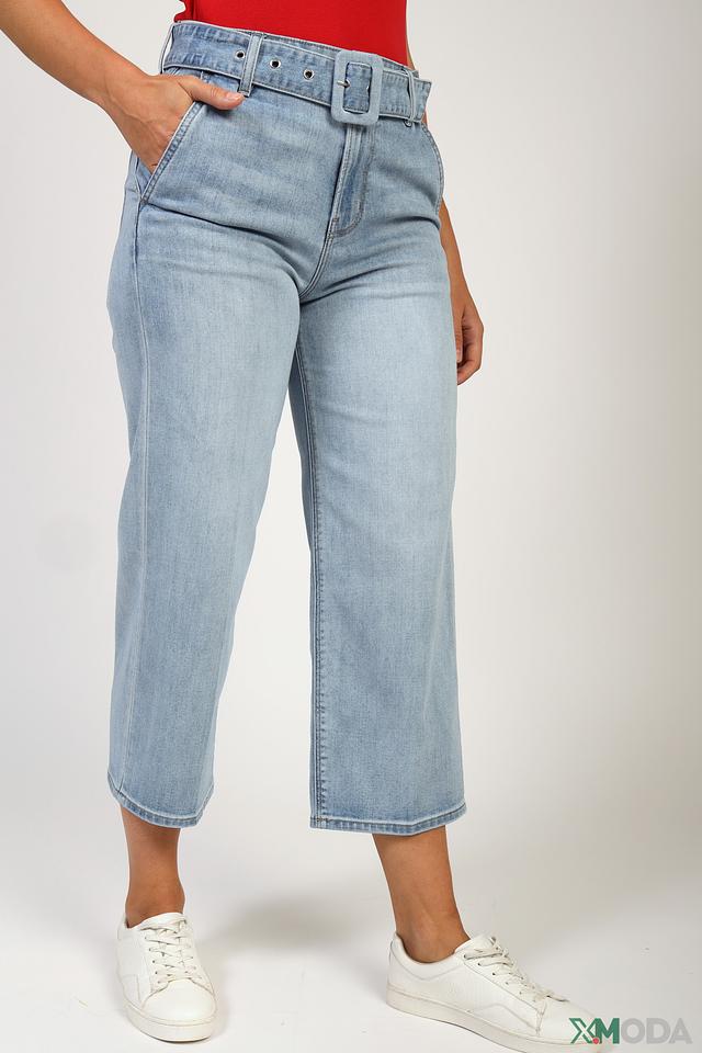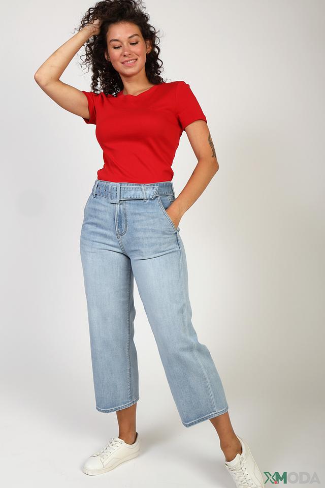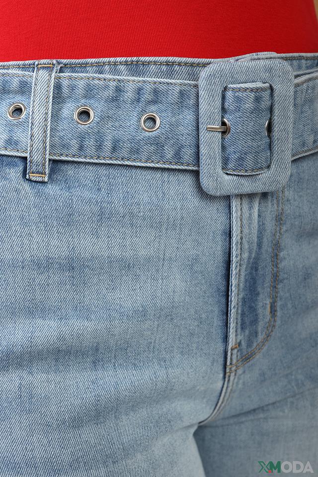 Брюки имеют широкие штанины и высокую посадку, что визуально удлиняет ноги и подчеркивает талию. Застежка осуществляется на молнию и пуговицу. Отличительной особенностью модели является широкий пояс с металлической пряжкой, который акцентирует внимание на талии и добавляет образу завершенность.