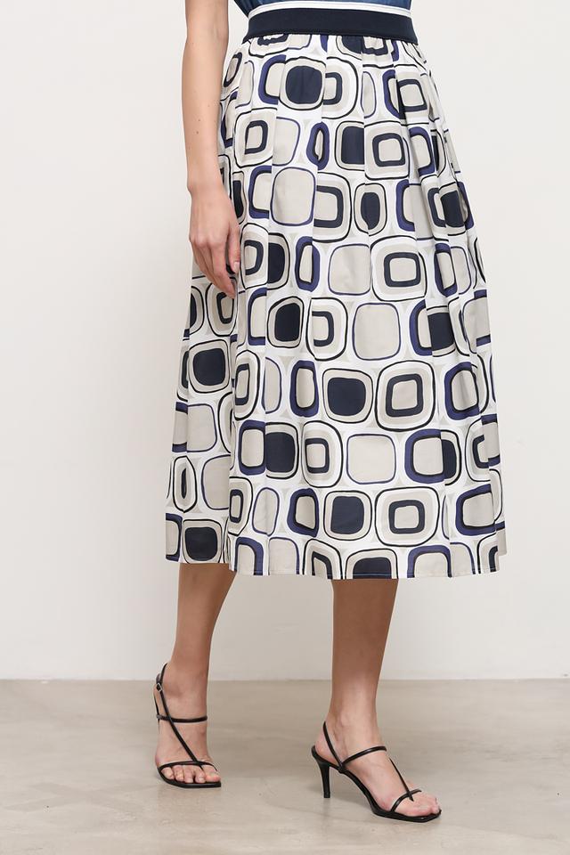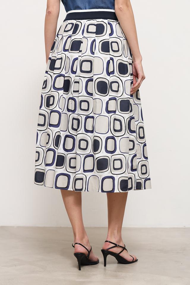 Дизайн юбки представлен в виде яркого геометрического принта, сочетающего в себе оттенки синего, белого и кремового. Принт придает юбке оригинальность и делает ее отличным вариантом для тех, кто любит выделяться из толпы.