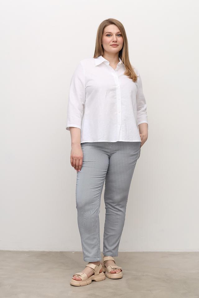 Рубашка имеет прямой крой, который обеспечивает свободу движений и подходит для различных типов фигур. Рукава 3/4 добавляют образу лёгкости и непринуждённости. Классический воротник и застёжка на пуговицы придают рубашке элегантный вид.