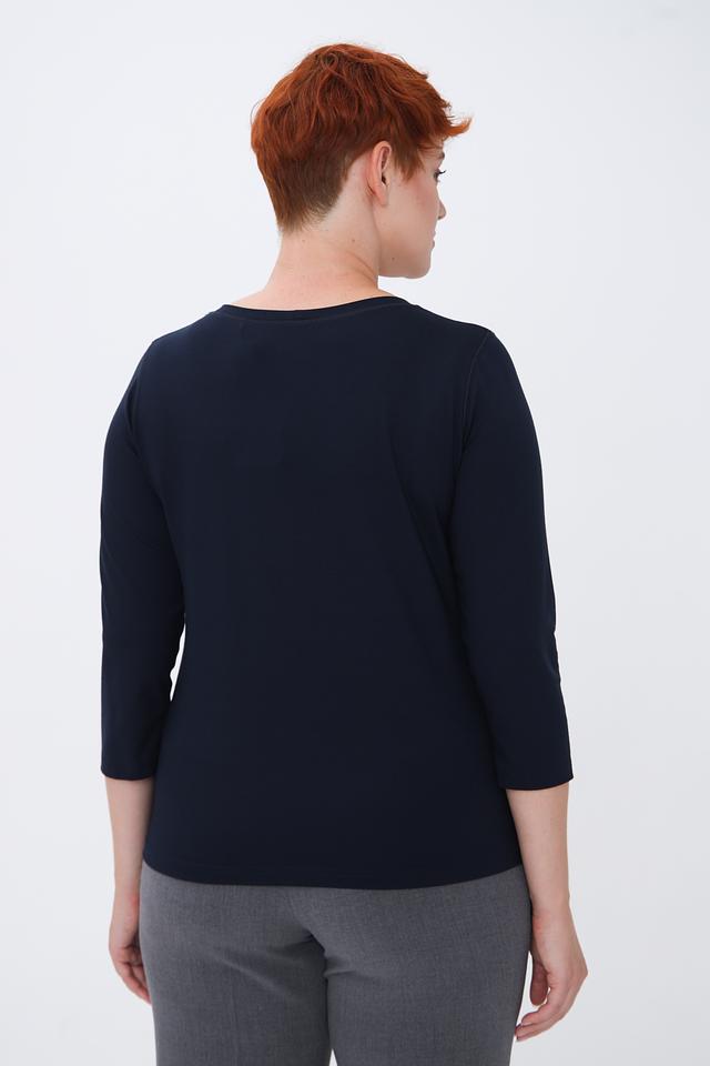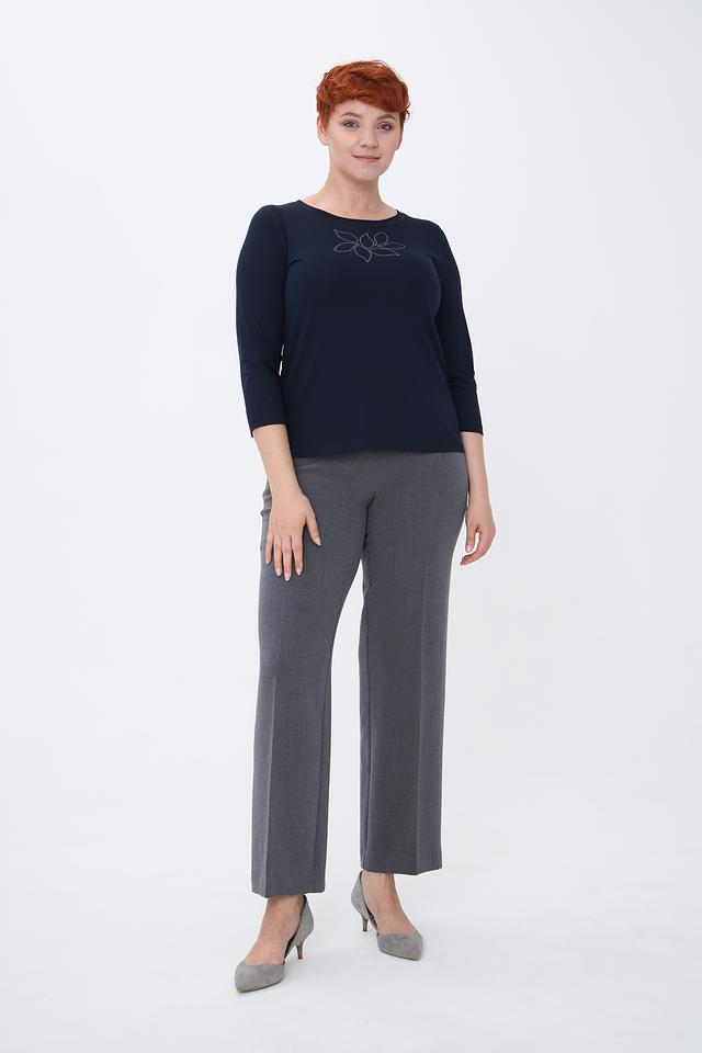 Особенностью модели является декоративная вышивка в виде цветка, выполненная светлыми нитями, что придает лонгсливу изысканность и оригинальность. Лонгслив имеет удобный крой с рукавами три четверти и круглым вырезом горловины.