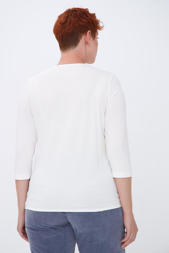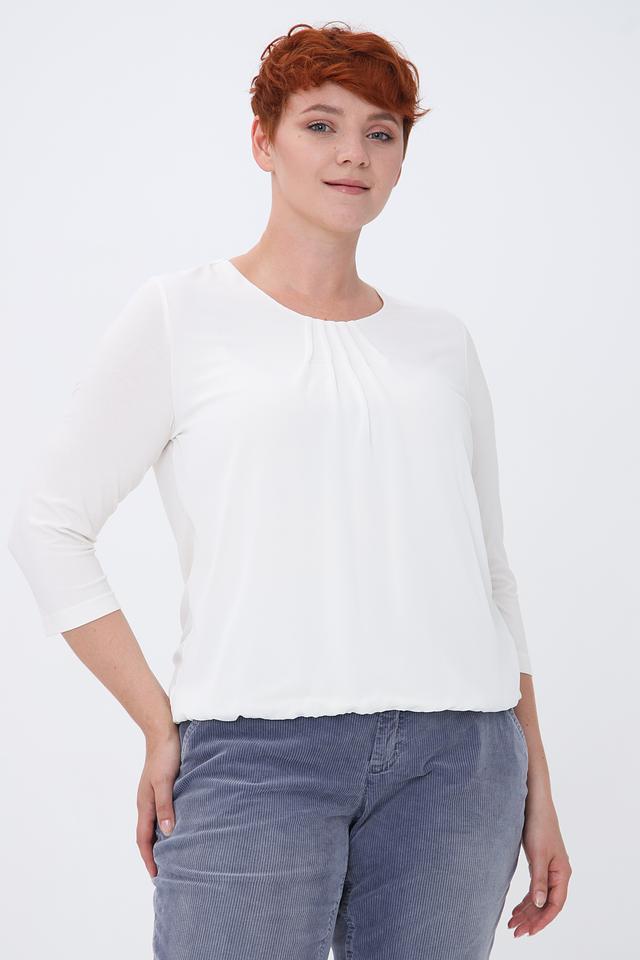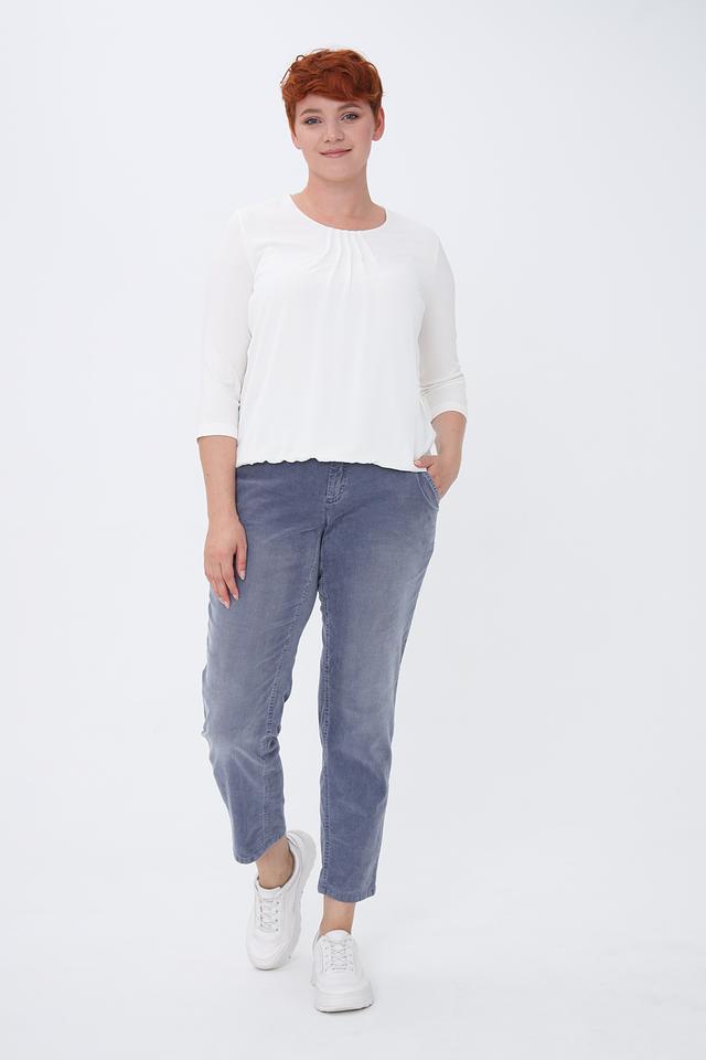 Блуза имеет прямой крой, рукава длиной 3/4 и круглый вырез горловины, украшенный мягкой драпировкой. Это придает модели изысканность и женственность.