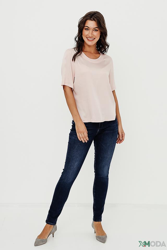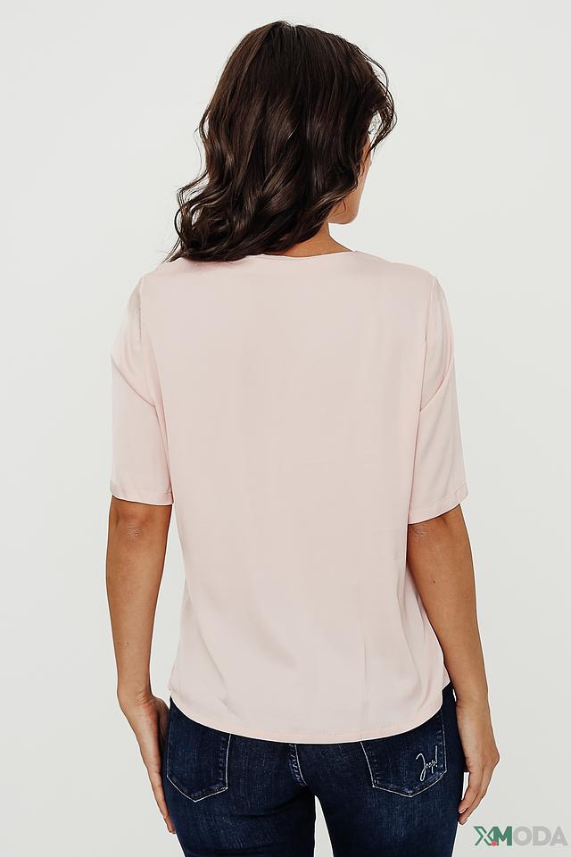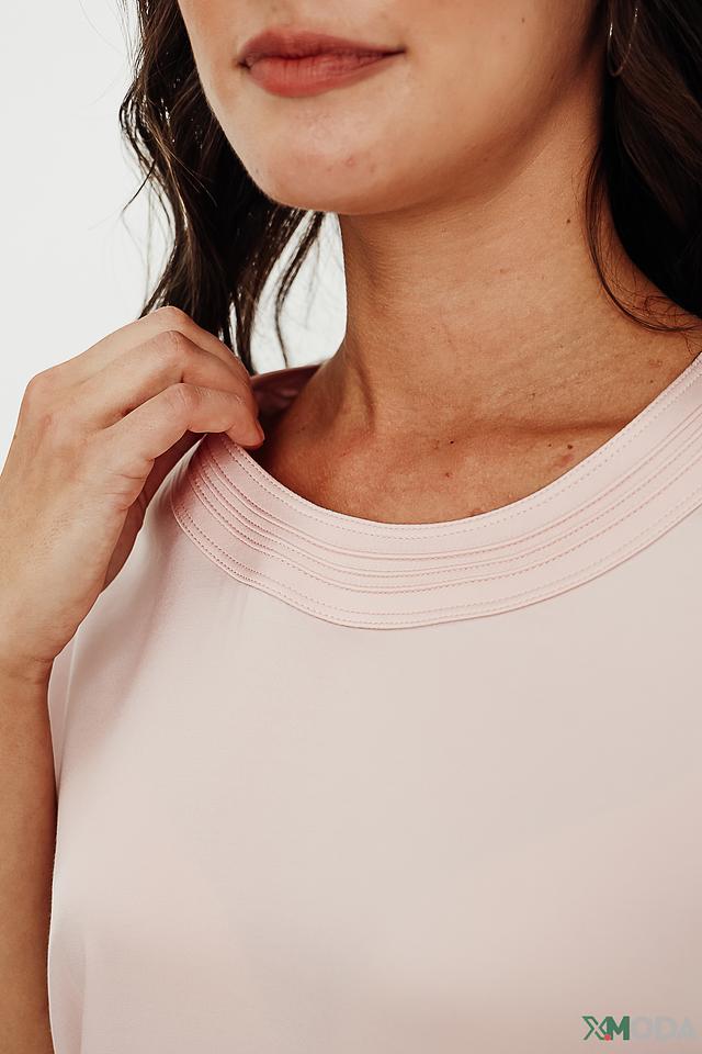 Блуза имеет прямой крой, короткие рукава и классический круглый вырез горловины. Нежный пудрово-розовый цвет делает эту модель универсальной и легко сочетаемой с различными элементами гардероба.