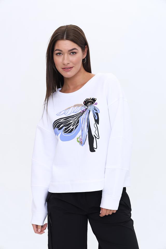 Основным акцентом пуловера является яркий принт бабочки, выполненный в сочетании чёрного, голубого и лавандового цветов. Принт декорирован бисером, что придает изделию изысканность и оригинальность.
