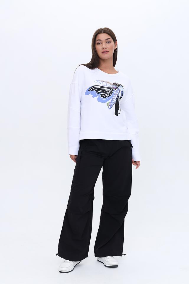 Белый пуловер Sportalm с ярким принтом бабочки станет стильным дополнением к вашему гардеробу. Модель выполнена из мягкого хлопка с добавлением эластана для комфорта и свободы движений. Оригинальный дизайн с принтом и черной молнией на спине. Состав: хлопок 98%, эластан 2%