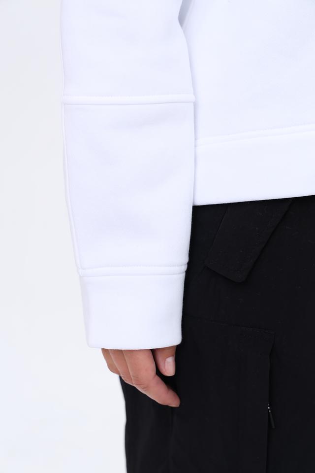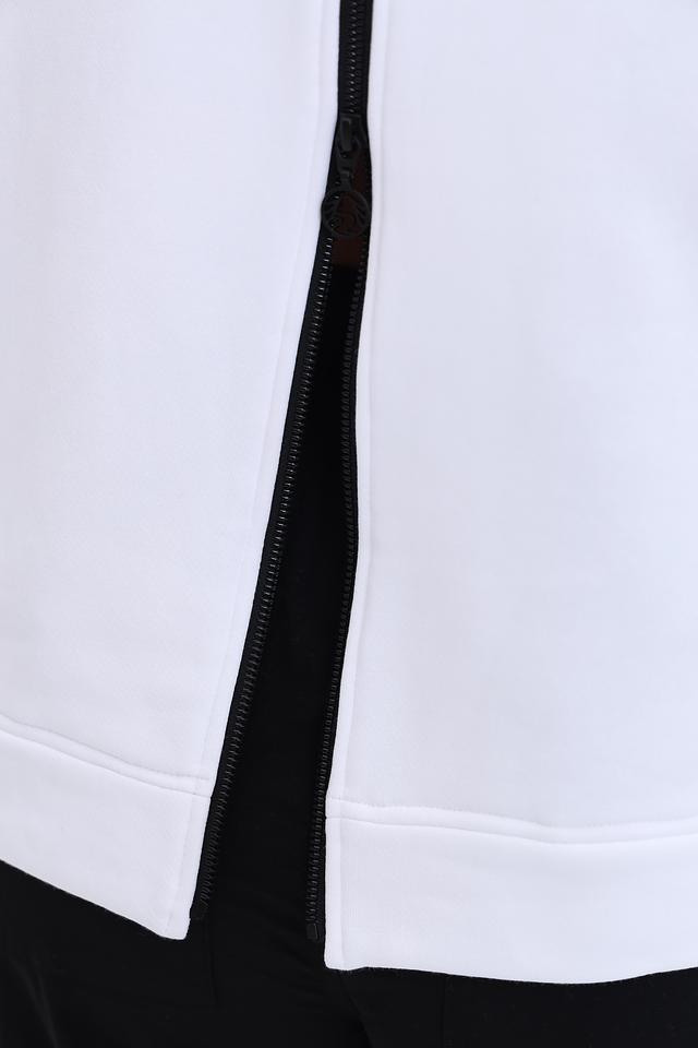 Пуловер изготовлен из высококачественного хлопка (98%) с добавлением эластана (2%), что обеспечивает мягкость, приятные тактильные ощущения и хорошую посадку по фигуре. На спине расположена черная молния, которая добавляет модели функциональности и стиля.