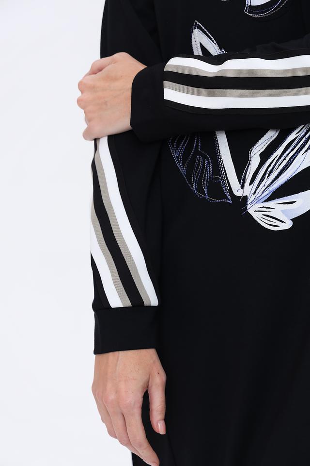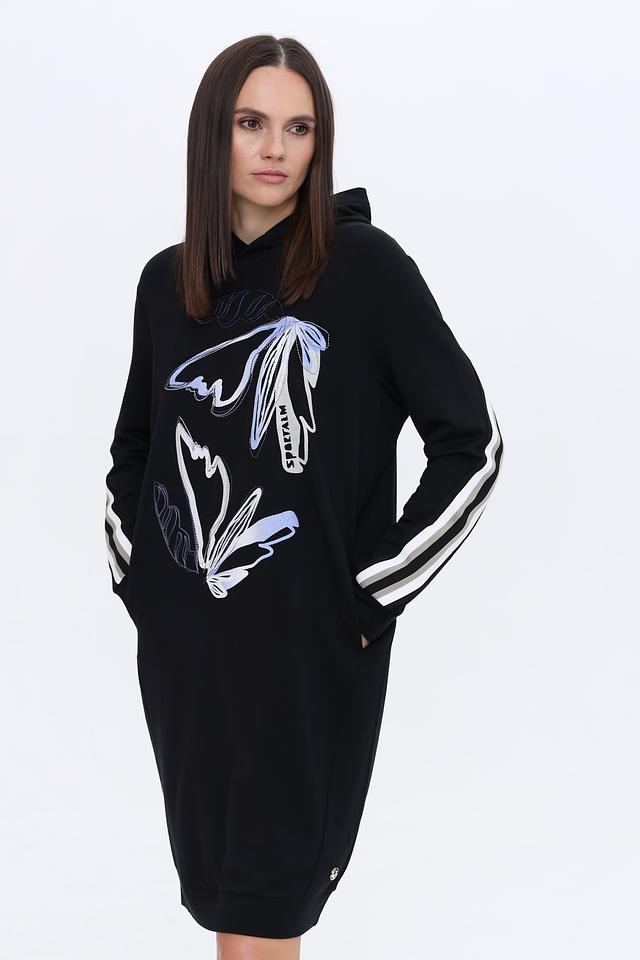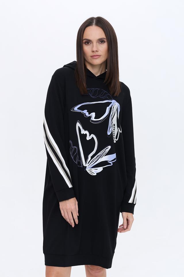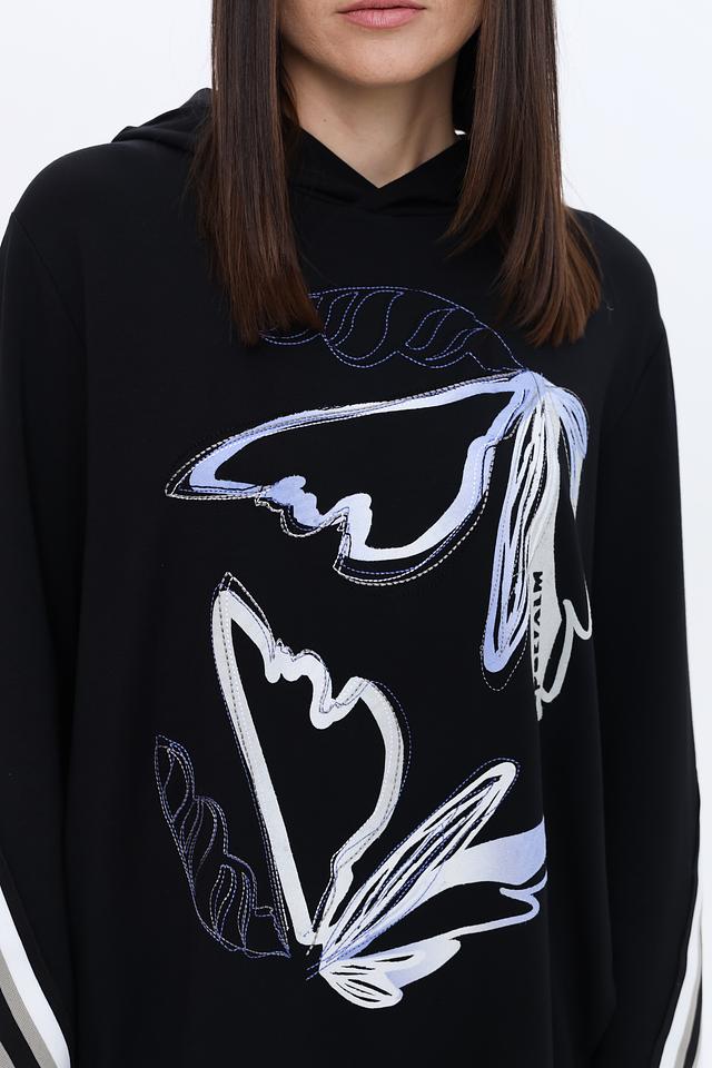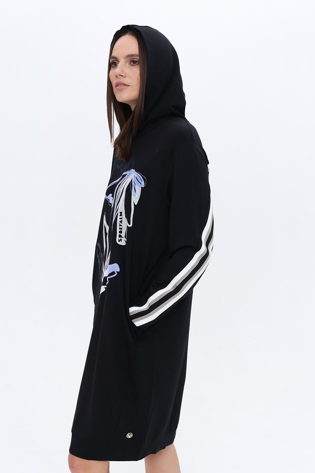 Чёрное платье Sportalm с оригинальным принтом в виде лица и рукавов с белыми полосками. Удобный капюшон и свободный крой делают это платье отличным выбором для повседневной носки. Состав: модал 96%, эластан 4%