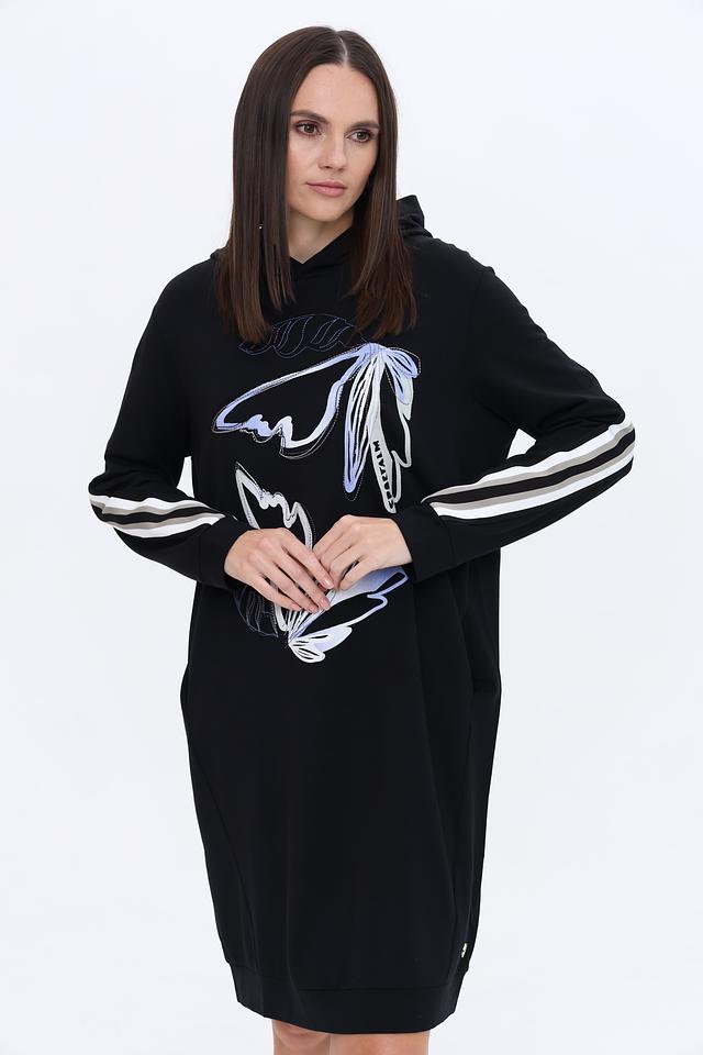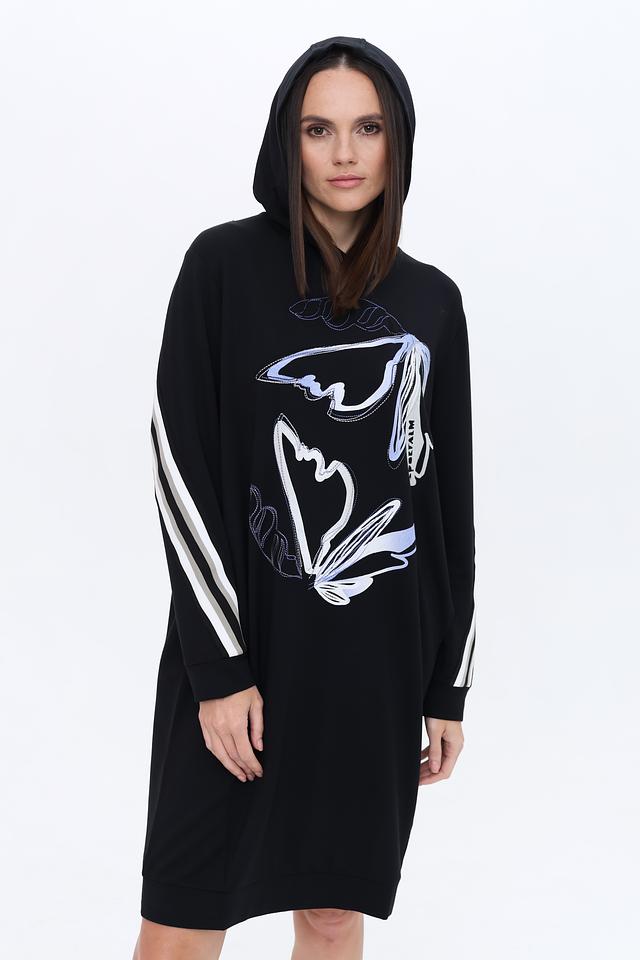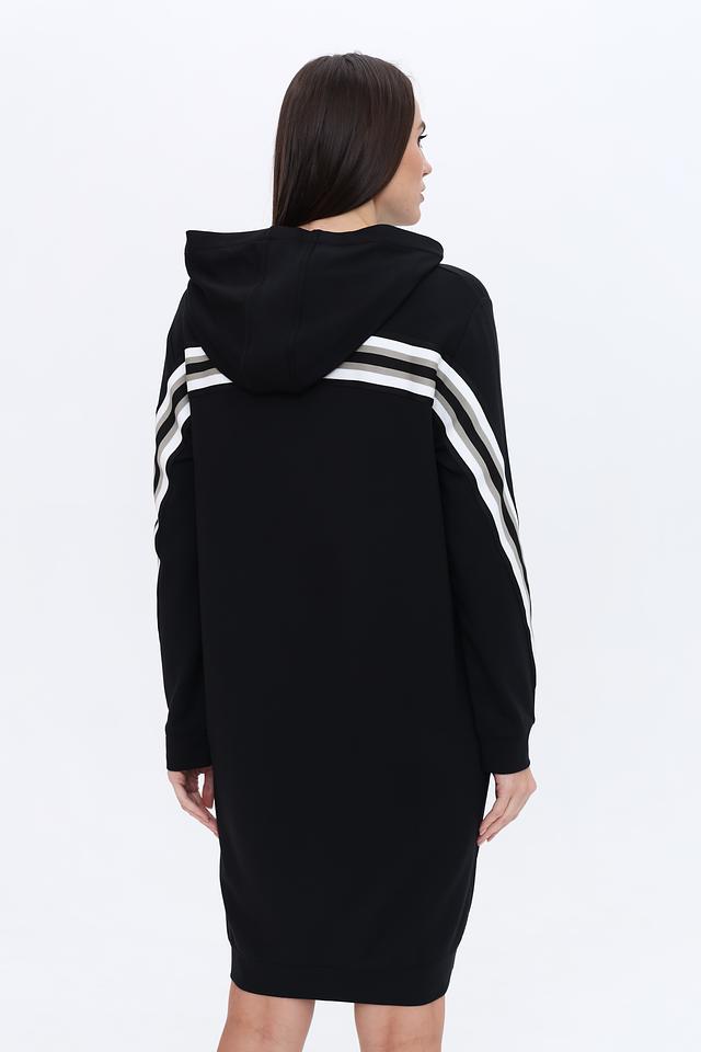 Платье имеет удобный капюшон, который добавляет образу непринужденности. Свободный крой обеспечивает комфорт при носке, а рукава с белыми полосками придают платью спортивный акцент.