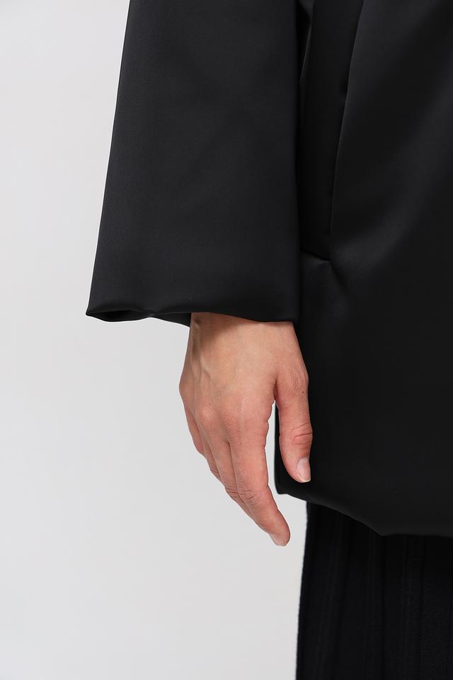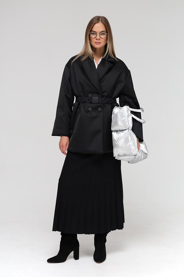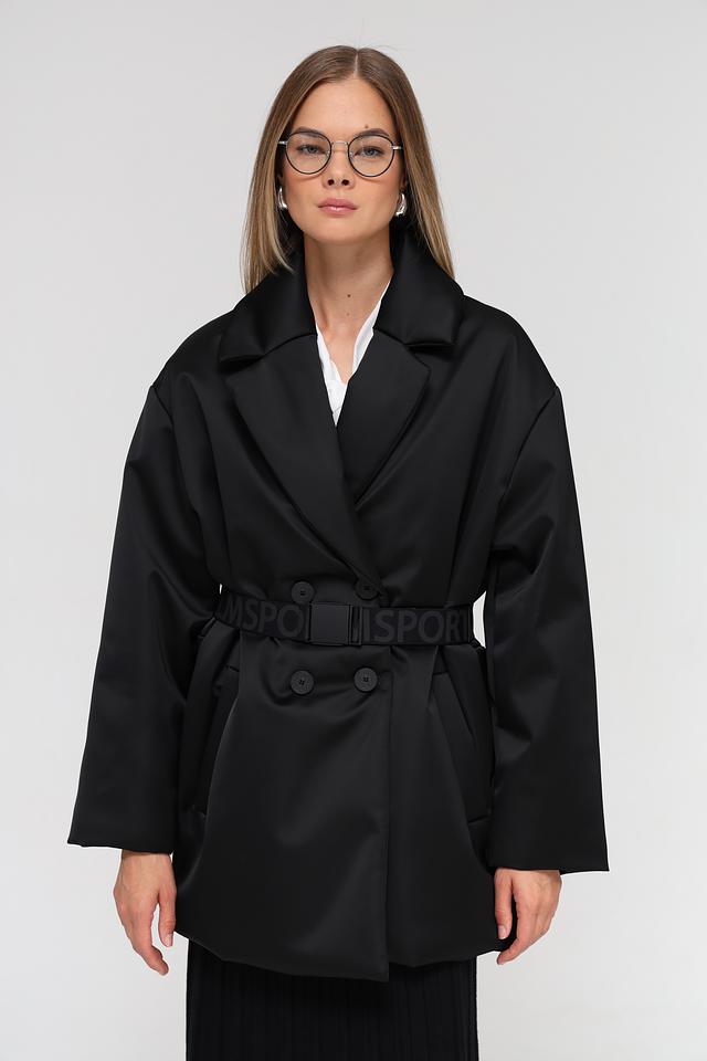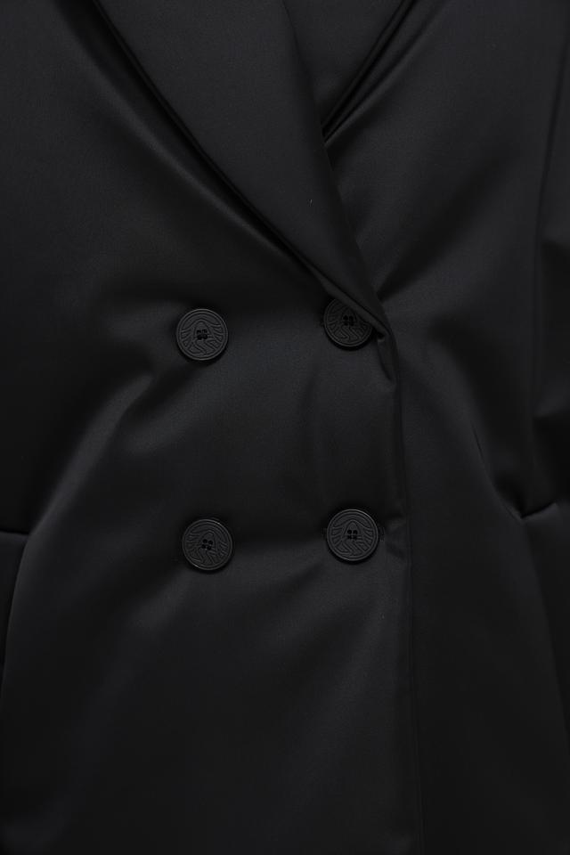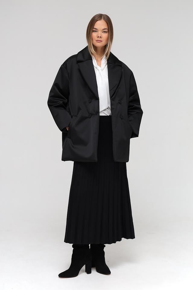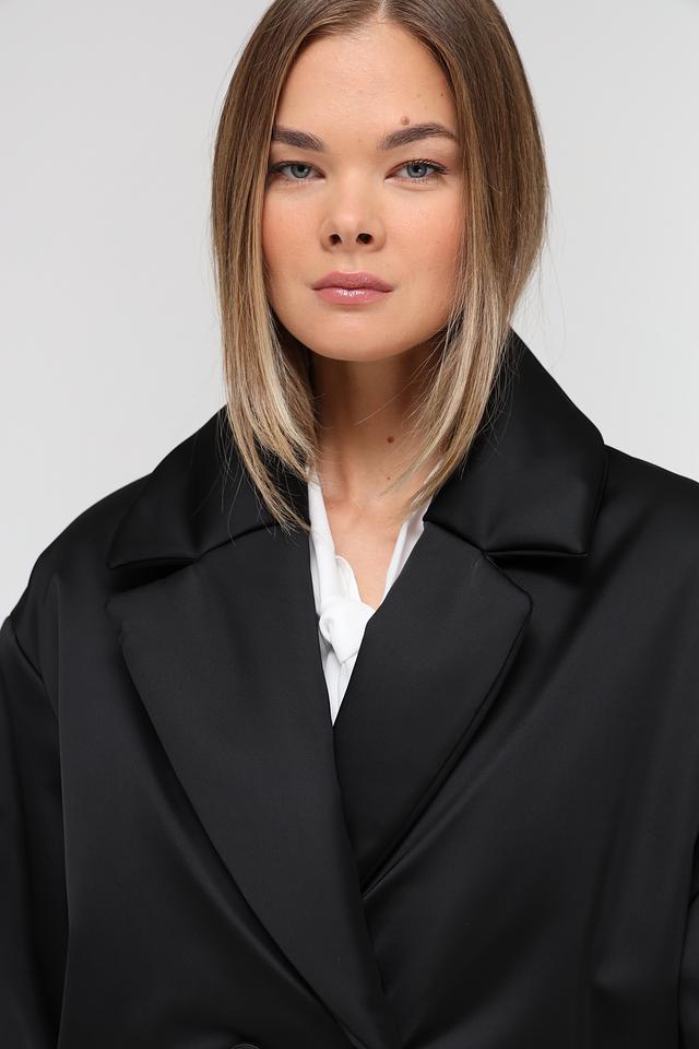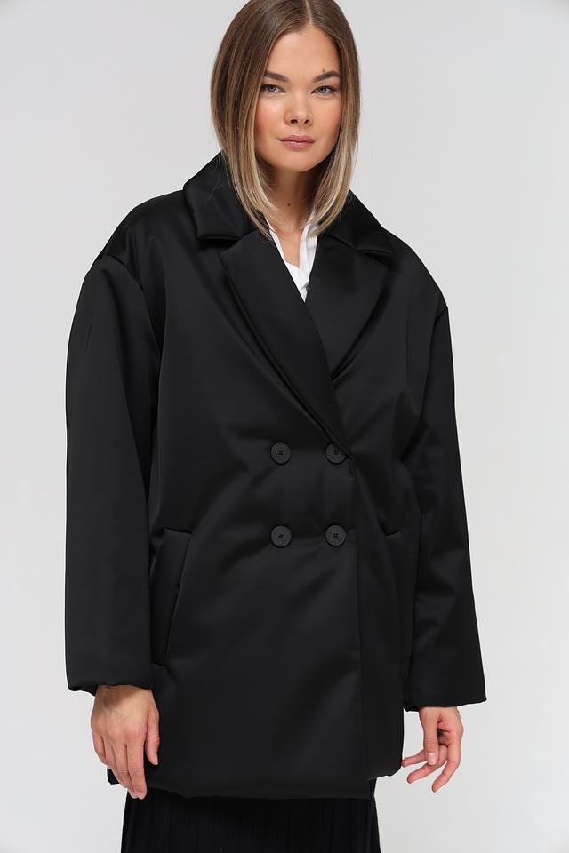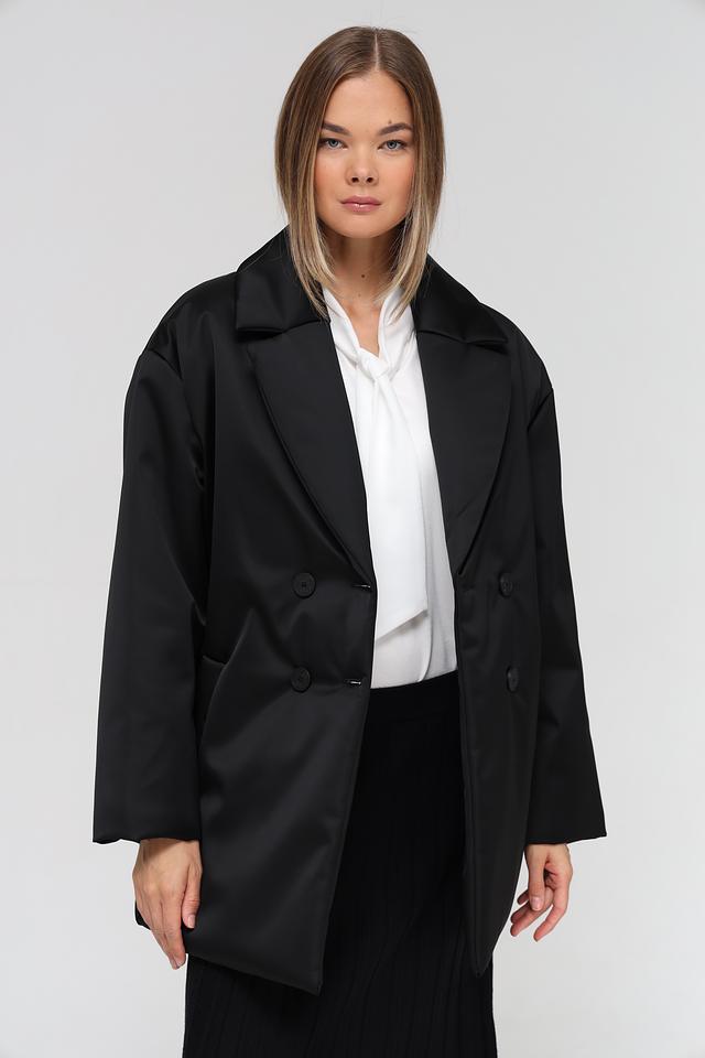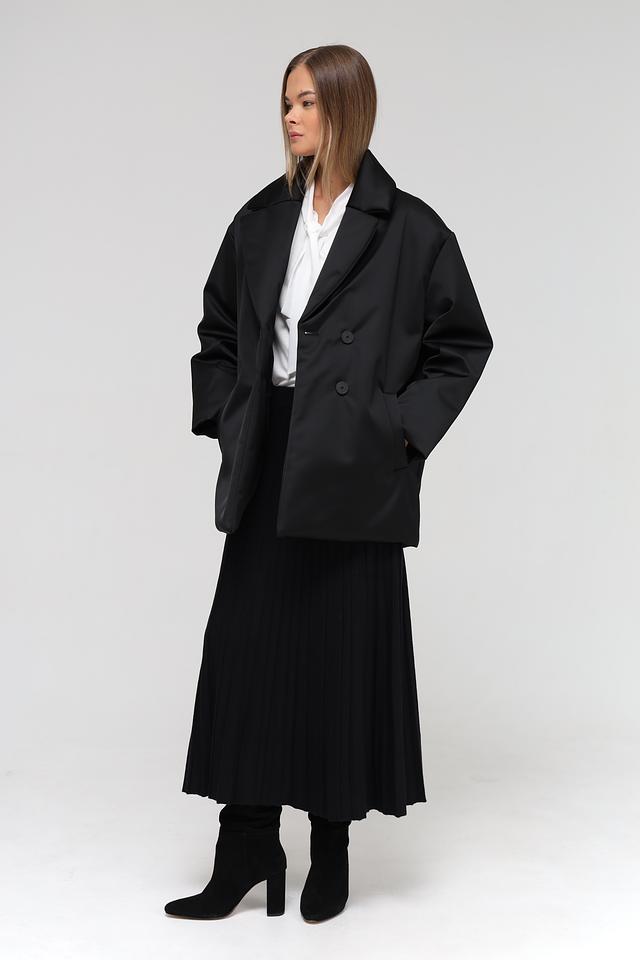 Куртка имеет двубортную застёжку на пуговицы, что придает ей элегантный вид. Прямой крой обеспечивает комфортную посадку по фигуре, а слегка завышенная линия талии подчеркивает достоинства силуэта.