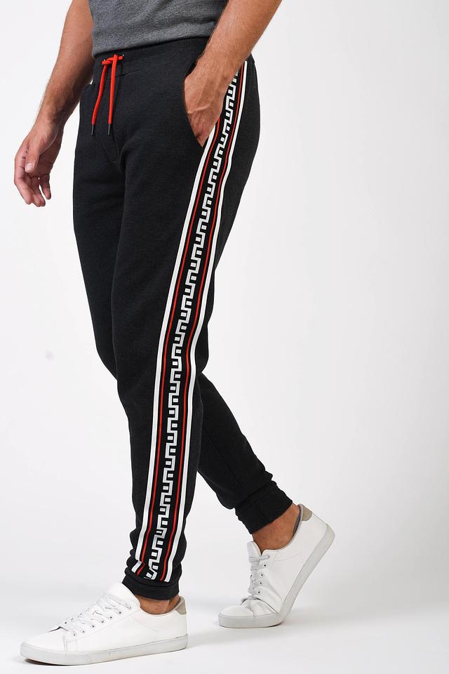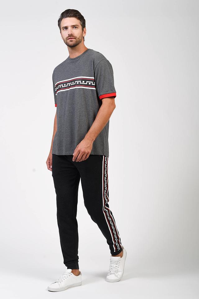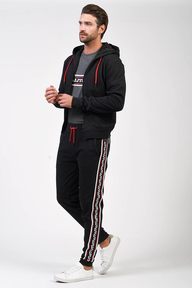 Особенностью данной модели является контрастная полоса, проходящая по боковой части брюк. Полоса выполнена в сочетании белого и красного цветов, что придает брюкам динамичный и современный вид. Брюки имеют два боковых кармана и манжеты внизу штанин, обеспечивающие удобство и практичность.