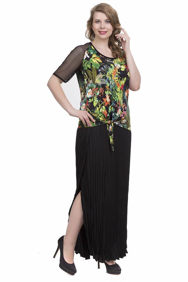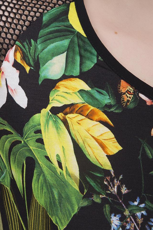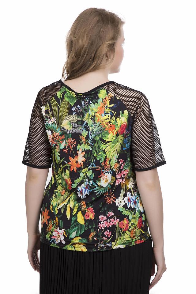 Блуза имеет свободный крой, короткие рукава и круглый вырез горловины. Оригинальный цветочный принт добавляет образу женственности и легкости. Вставки из сетки на плечах и рукавах придают блузе воздушность и игривость.