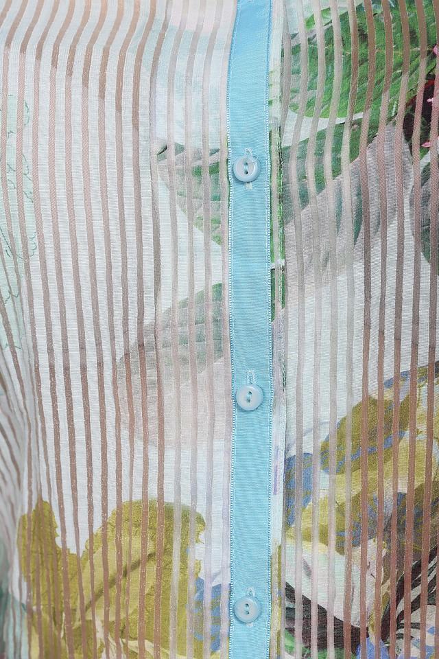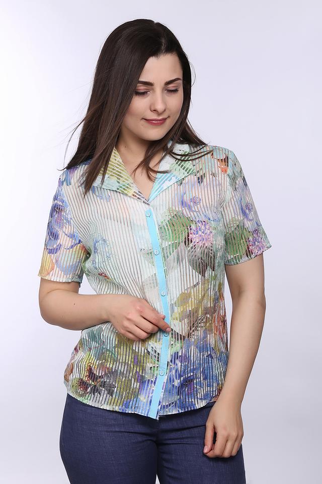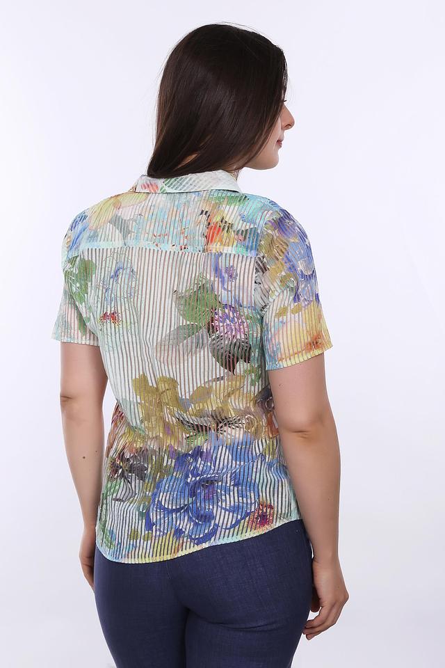 Блуза имеет прямой крой, короткие рукава и классический воротник. Её украшает яркий и красочный цветочный принт, который добавляет образу женственности и лёгкости. Застёжка на пуговицы по всей длине изделия.