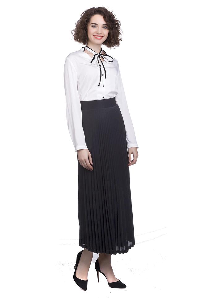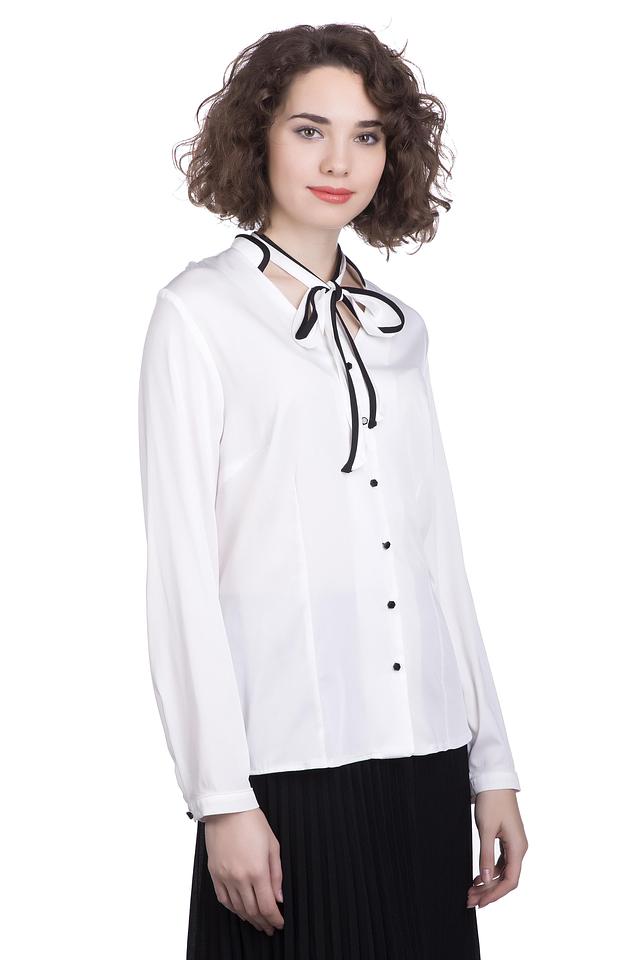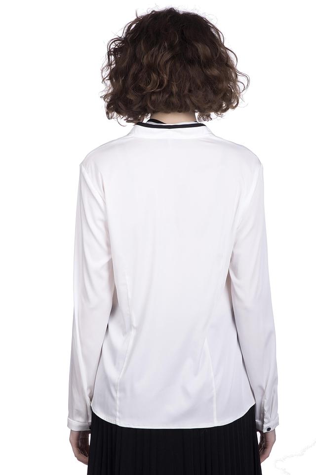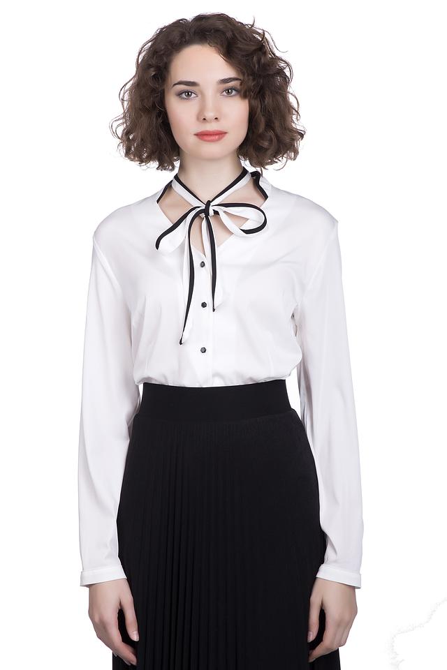 Блуза имеет длинные рукава и классический крой, который подчеркивает фигуру. Главной особенностью модели являются чёрные завязки на шее, которые можно завязать различными способами, создавая уникальный образ.