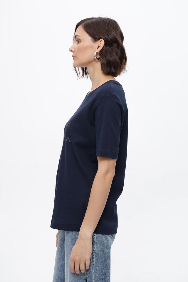 Основной цвет футболки – насыщенный синий. Передняя часть украшена стильным принтом с надписью "Bonjour to Paris", выполненным в серебристых тонах. Принт добавляет образу легкость и непринужденность.