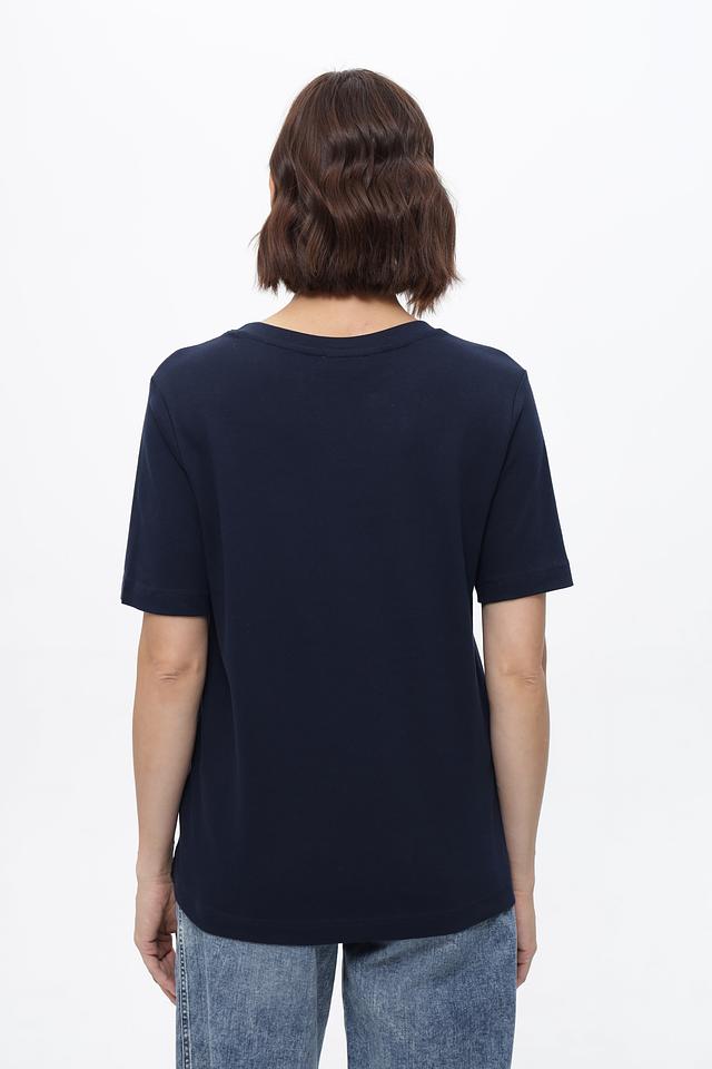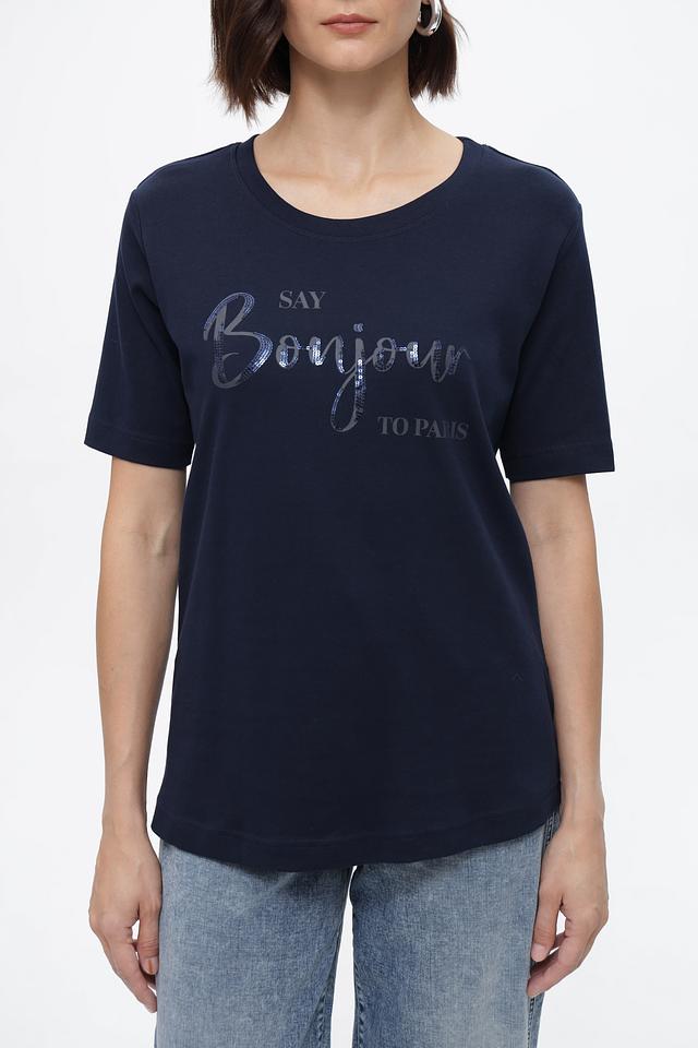 Синяя футболка Steilmann из 100% хлопка с эффектным принтом "Bonjour to Paris". Базовый крой и натуральный состав обеспечивают комфорт в повседневной носке. Состав: хлопок 100%