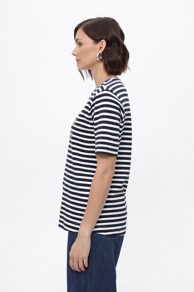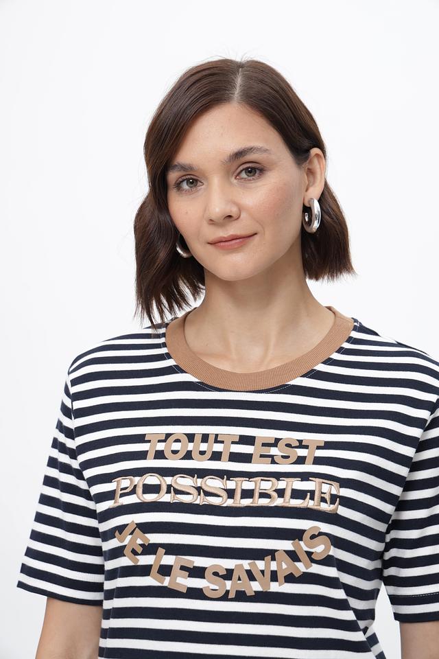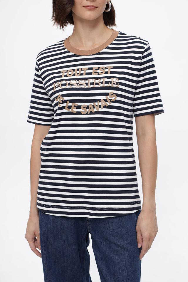 Женская футболка Steilmann синего цвета в классическую полоску, декорирована золотистой надписью. Изготовлена из 100% хлопка, обеспечивающего комфорт и воздухопроницаемость. Состав: хлопок 100%