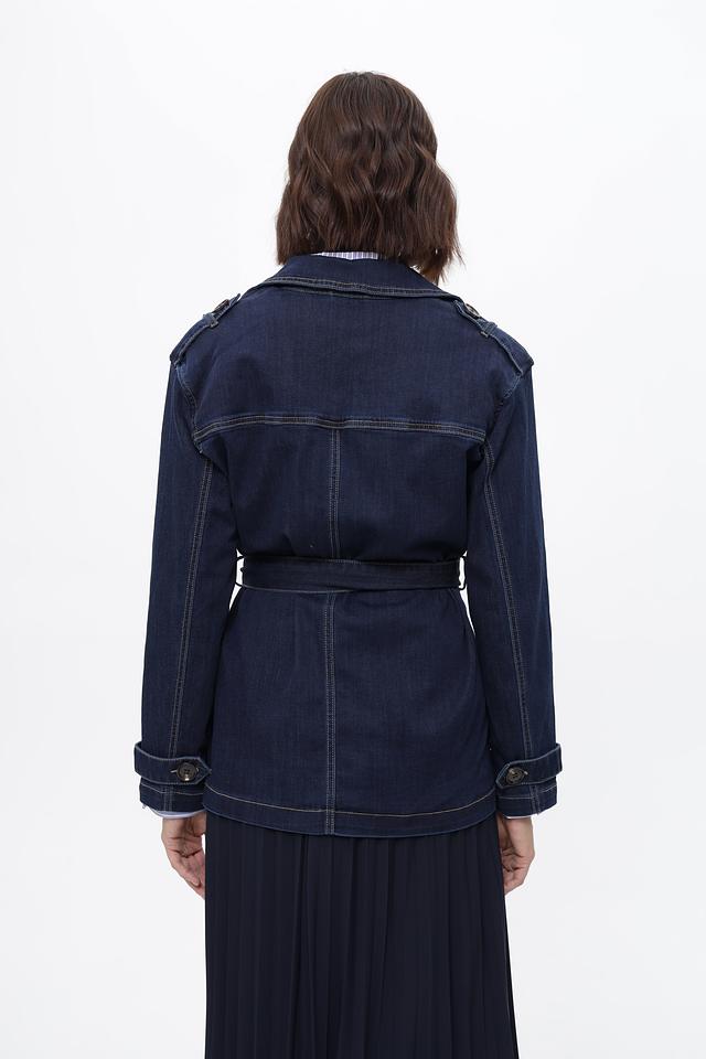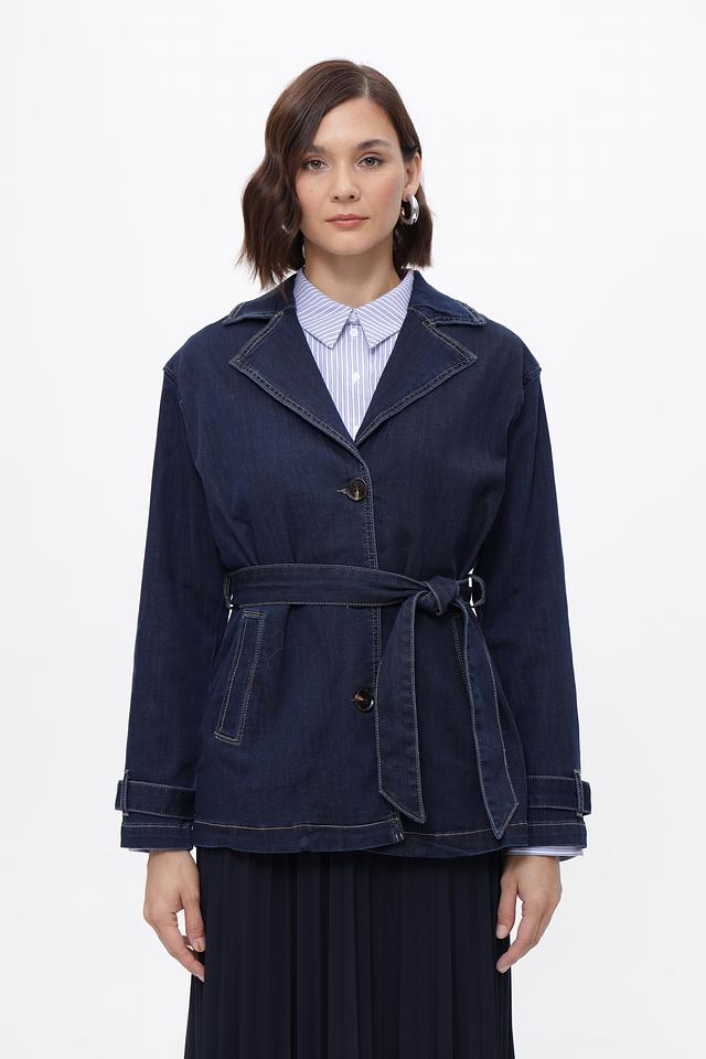 Жакет имеет прямой крой, отложной воротник и застегивается на пуговицы. Особенности модели - накладные карманы и пояс, который можно завязать на талии, чтобы подчеркнуть фигуру.