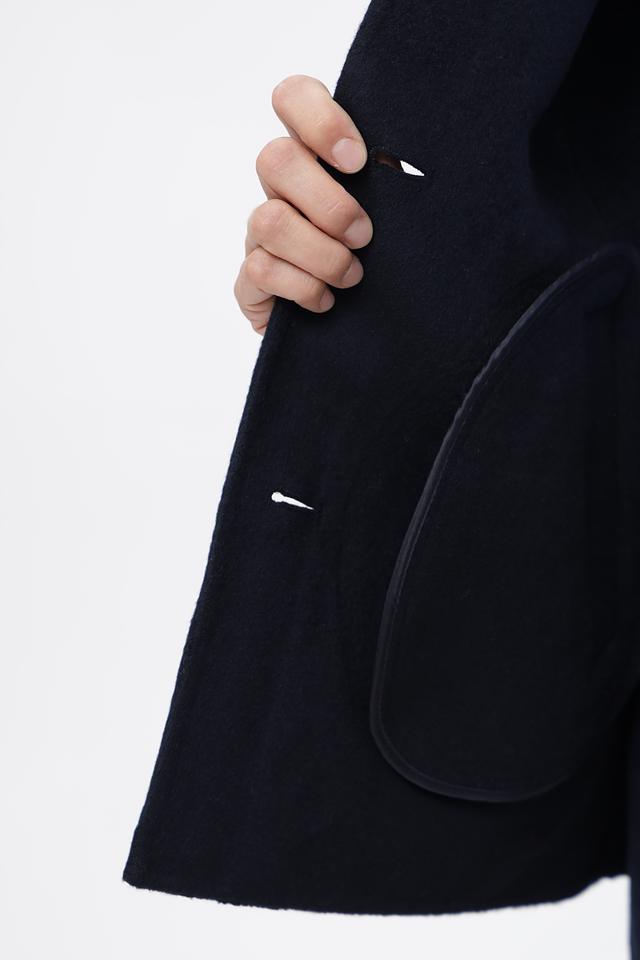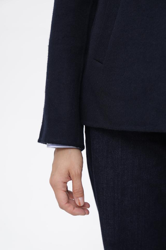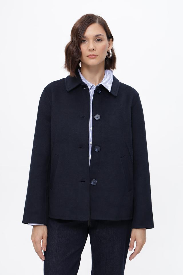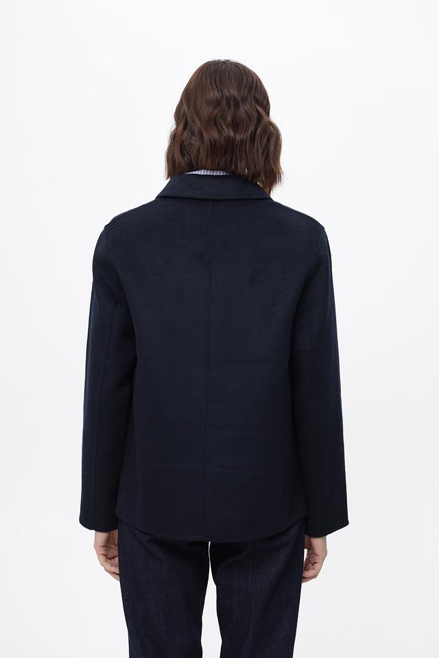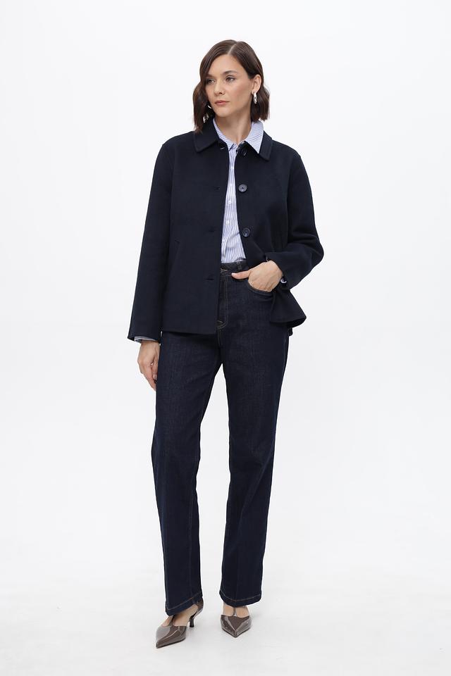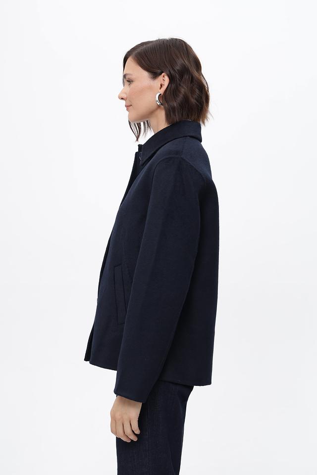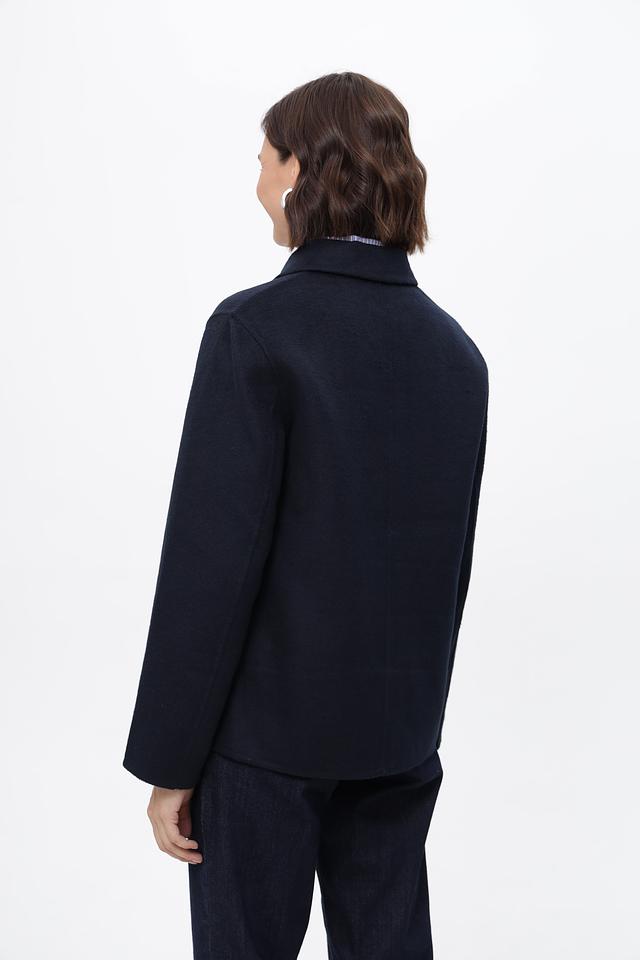 Жакет имеет два боковых прорезных кармана. Рукава длинные, с манжетами. Синий цвет жакета универсален и легко сочетается с различными элементами гардероба.