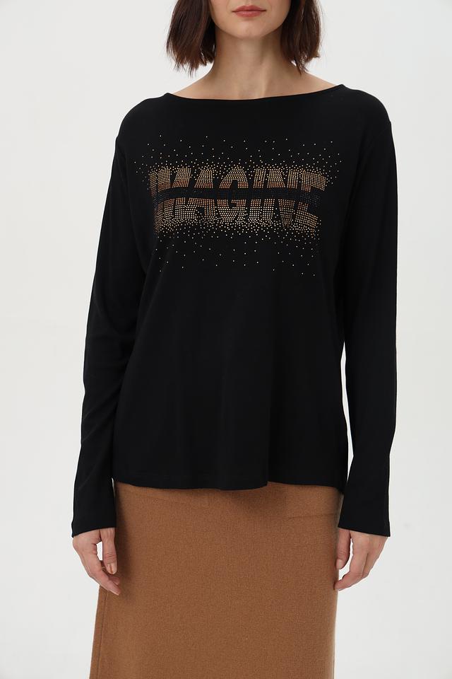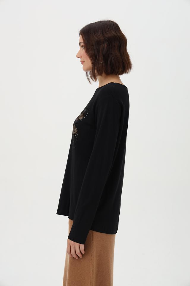 Лонгслив имеет классический крой с длинными рукавами и круглым вырезом горловины. Особое внимание привлекает декор из мелких страз, образующих графичный узор на передней части изделия. Этот элемент придает образу изысканность и блеск.