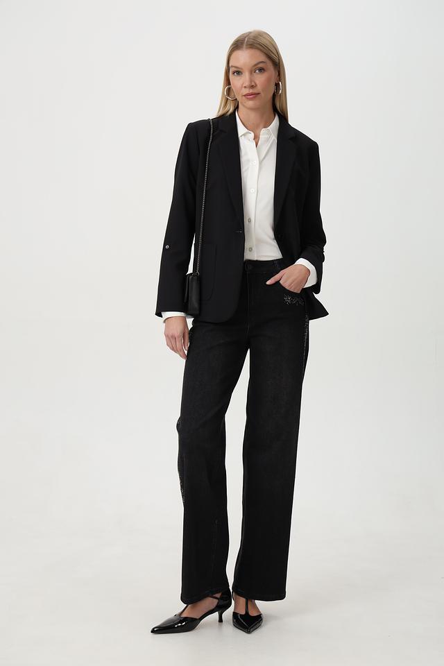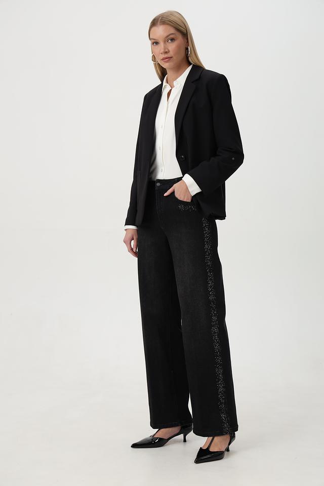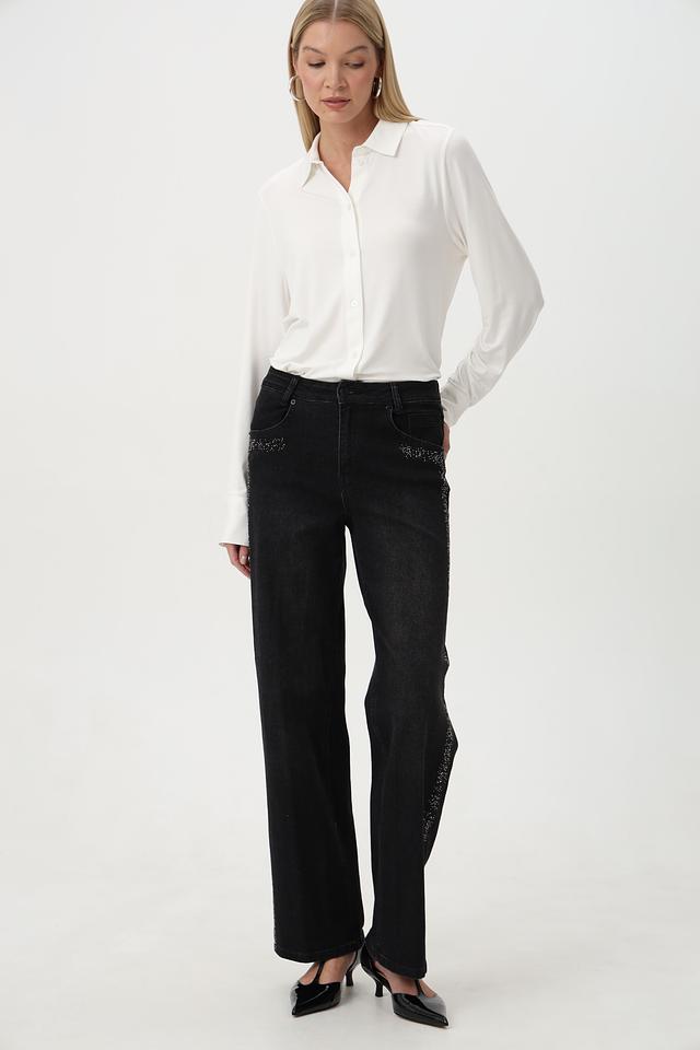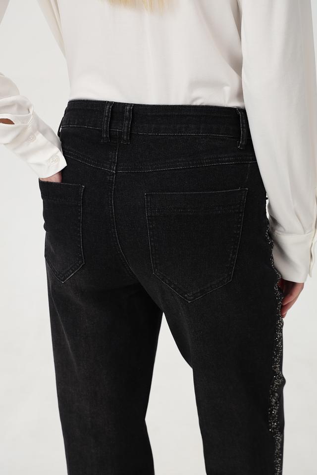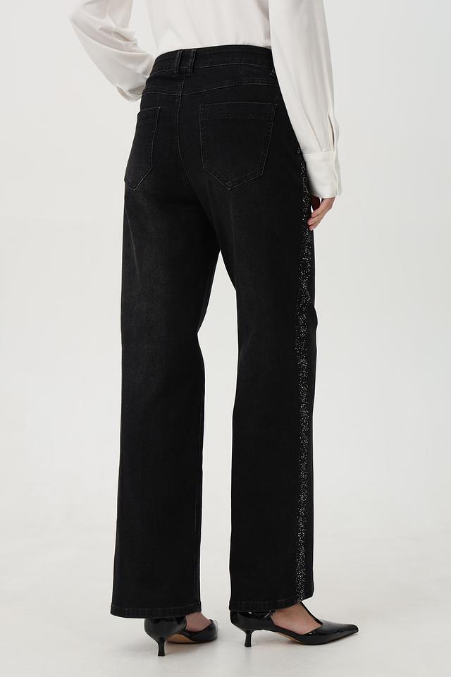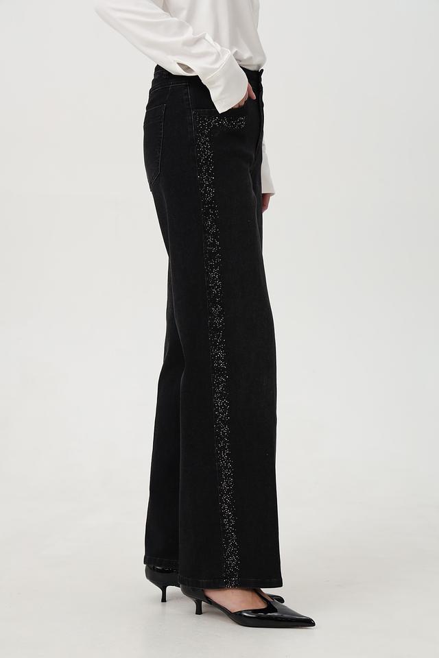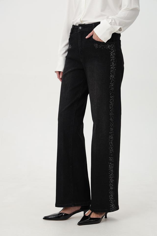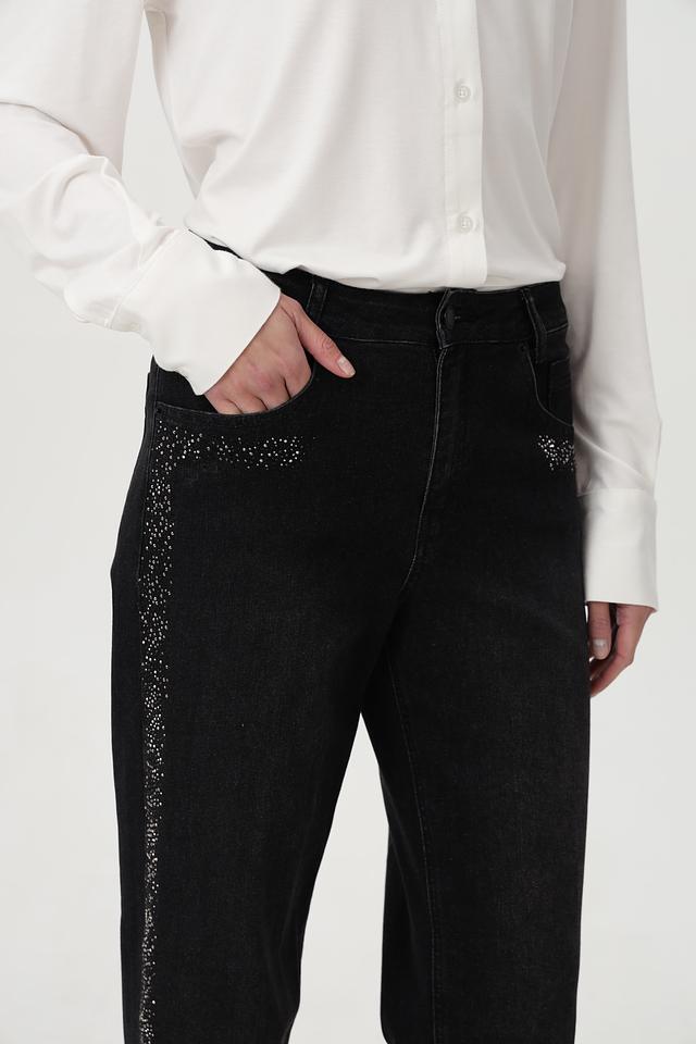 Особенностью этих джинсов является декор из страз, расположенный на карманах и по боковой части брюк, что придает им изысканность и индивидуальность. Крой – свободный, прямой, с высокой посадкой, обеспечивающий максимальный комфорт в носке и подчеркивающий достоинства фигуры.