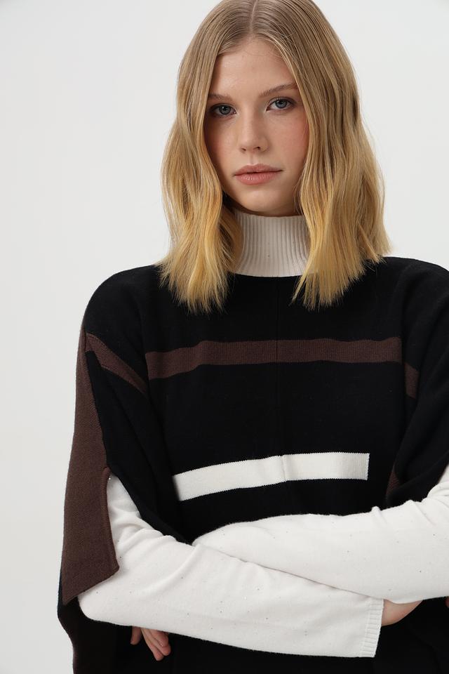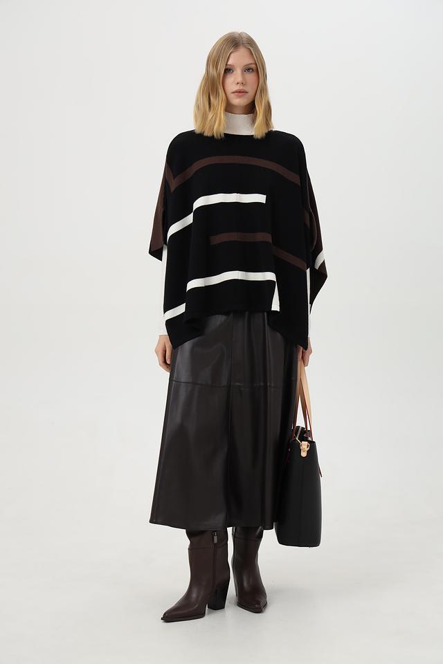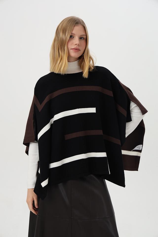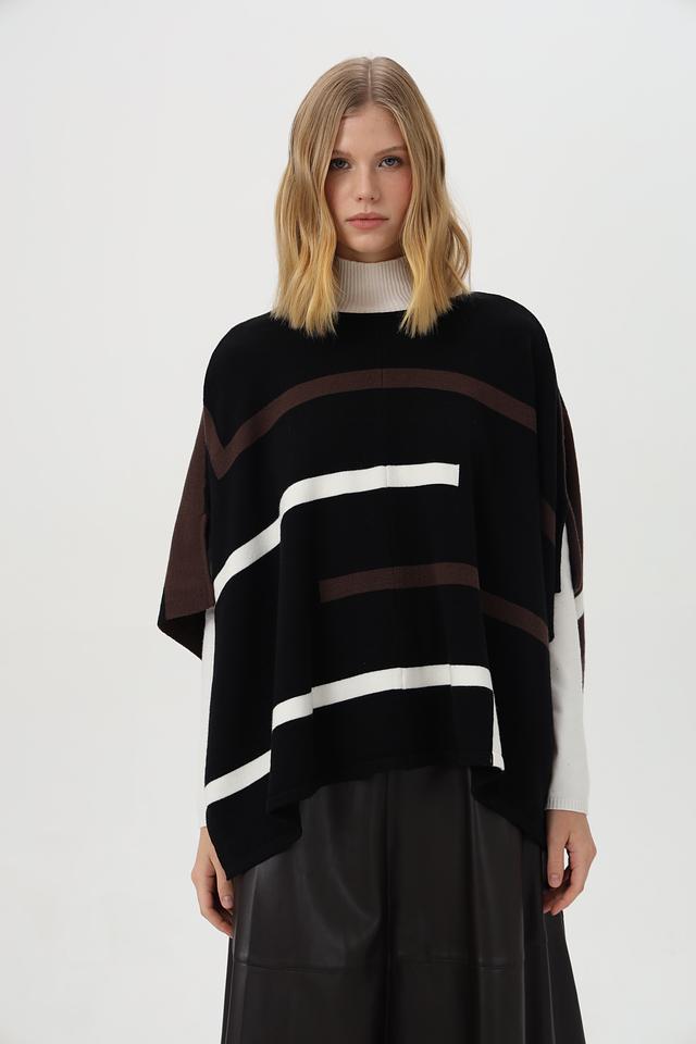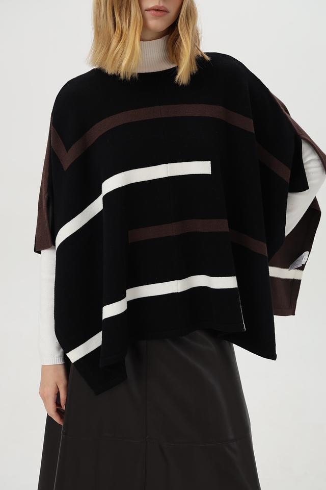 Дизайн пончо представлен широкими горизонтальными полосами, создающими эффектный визуальный образ. Это универсальная вещь, которая легко сочетается с различными элементами гардероба, от джинсов до юбок. Пончо идеально подойдет для создания стильных и комфортных образов на каждый день.