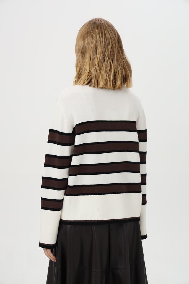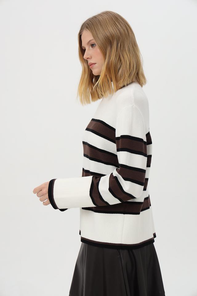 Представляем стильный пуловер от бренда Steilmann. Модель выполнена в белом цвете с горизонтальными полосами чёрного и коричневого оттенков, что придает ей актуальный вид.