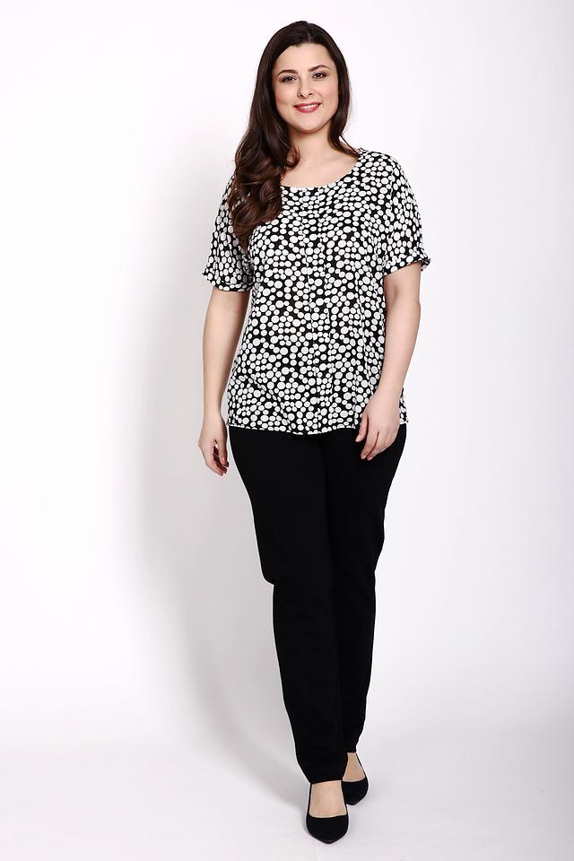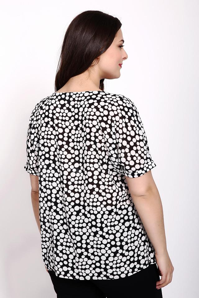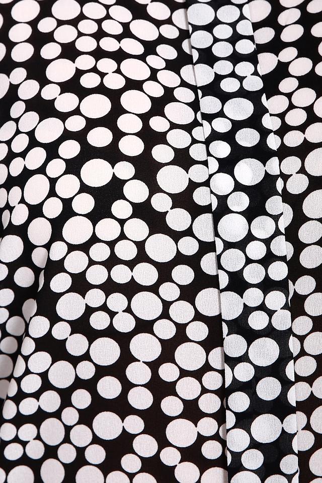 Основной цвет блузы – чёрный, а ярким акцентом служит белый принт в горошек. Такой рисунок придаёт образу игривость и лёгкость.