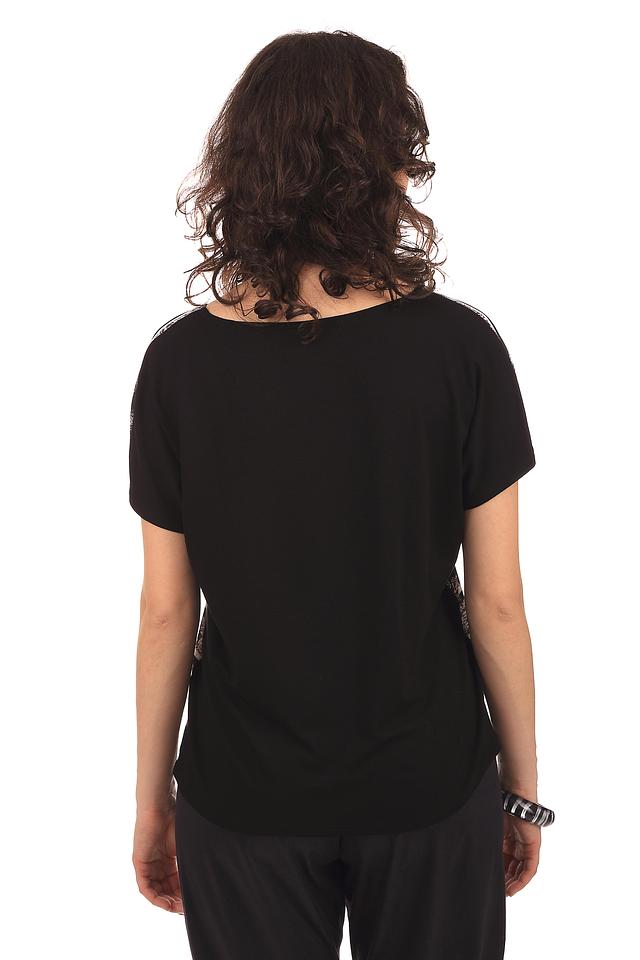 Блуза имеет свободный крой, который обеспечивает комфорт в носке. Короткие рукава делают её идеальным выбором для теплой погоды. Вырез горловины округлый, что придает образу женственность.