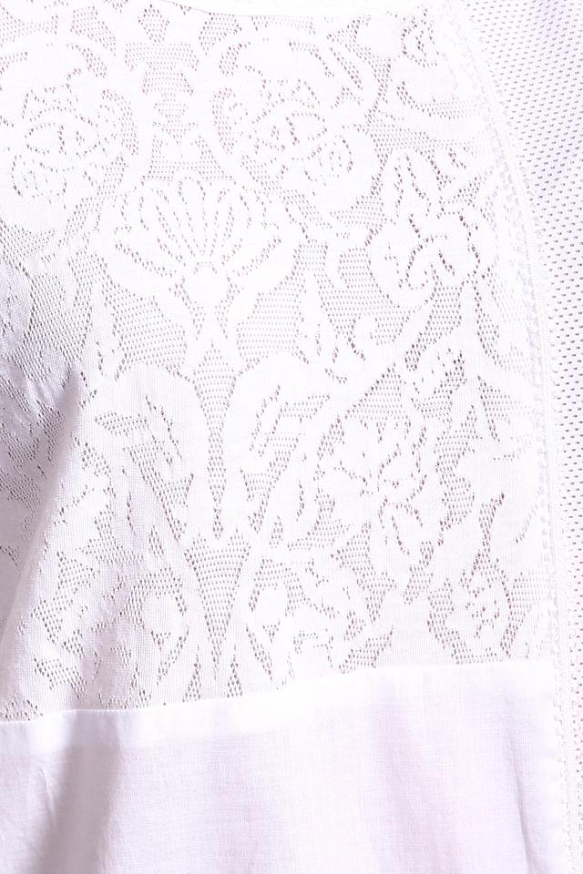 Основная часть блузы выполнена из гладкого хлопка, а передняя часть украшена нежным кружевом, придающим изделию легкость и женственность. V-образный вырез горловины подчеркивает элегантность силуэта.