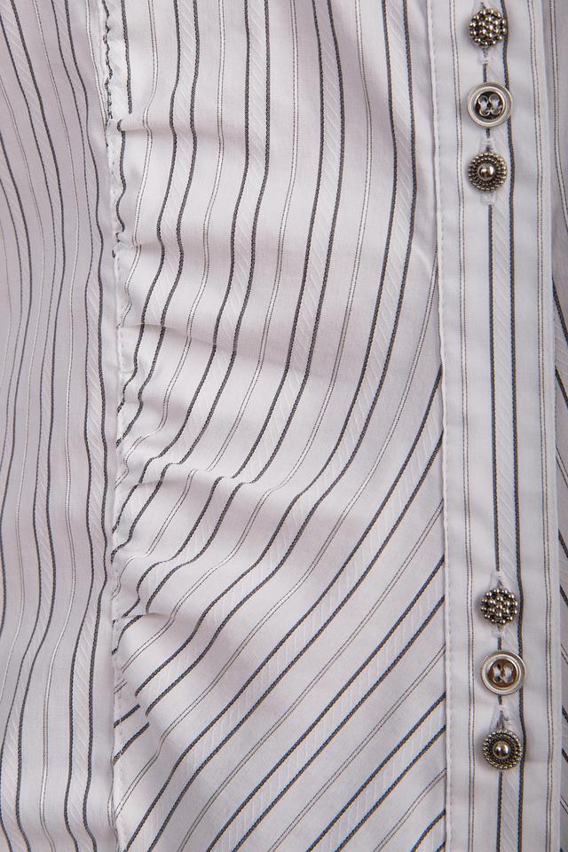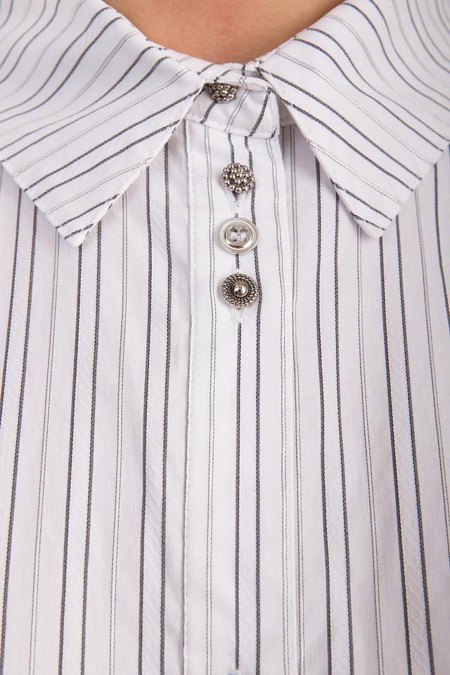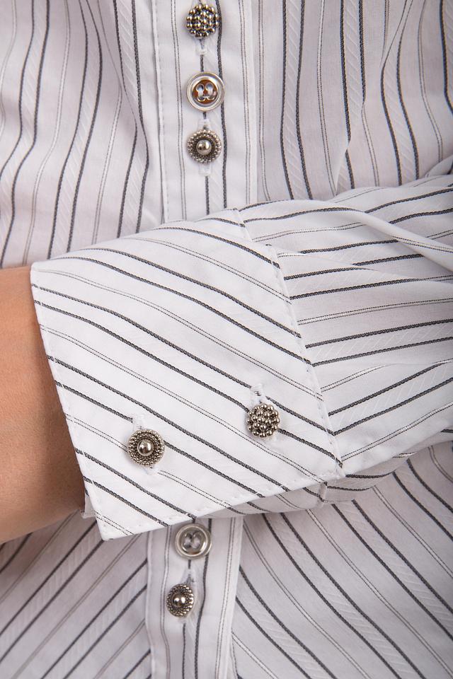 Блуза застегивается на ряд декоративных пуговиц, которые добавляют изысканности образу. Состав ткани включает хлопок, полиамид, полиэстер и эластан, что обеспечивает комфорт и практичность в носке.