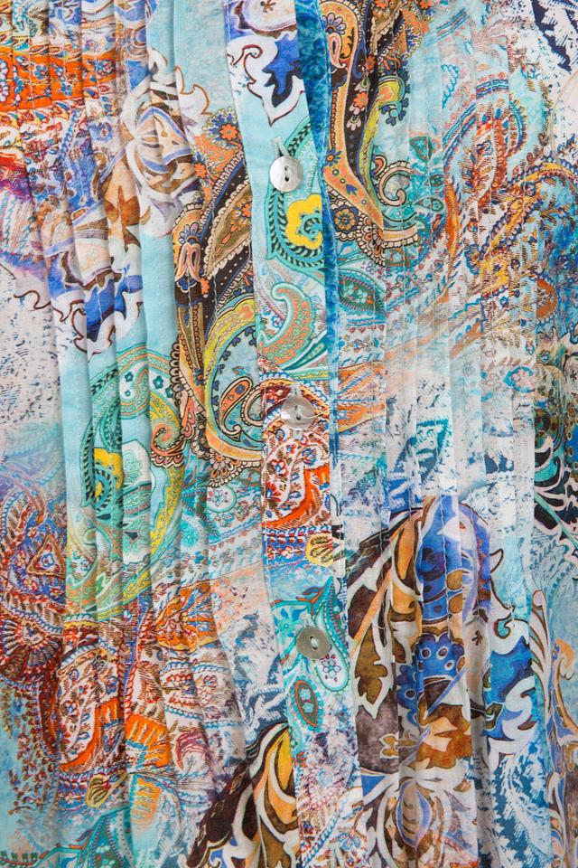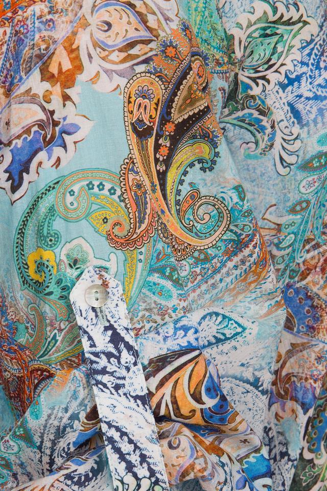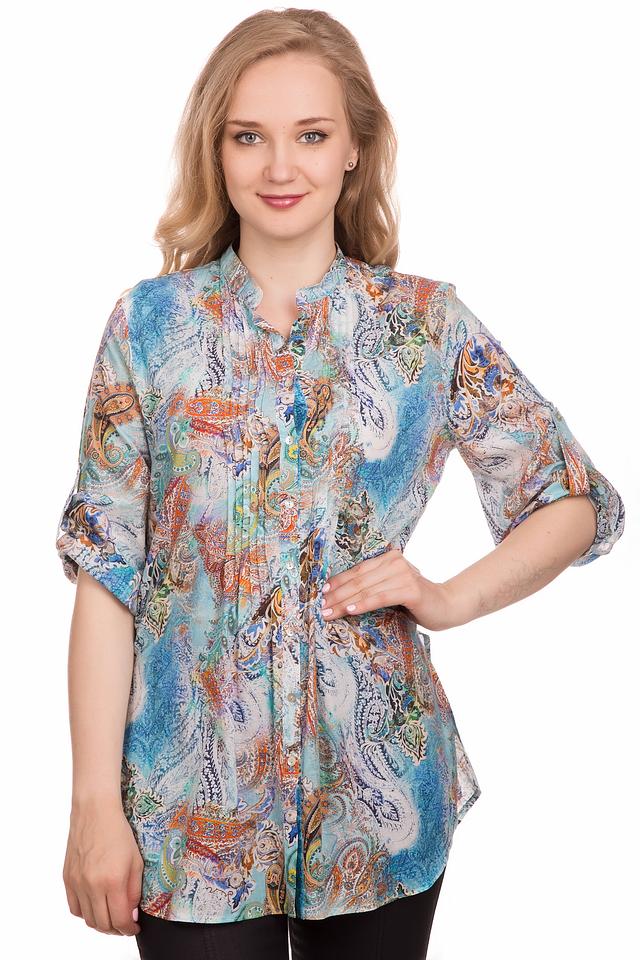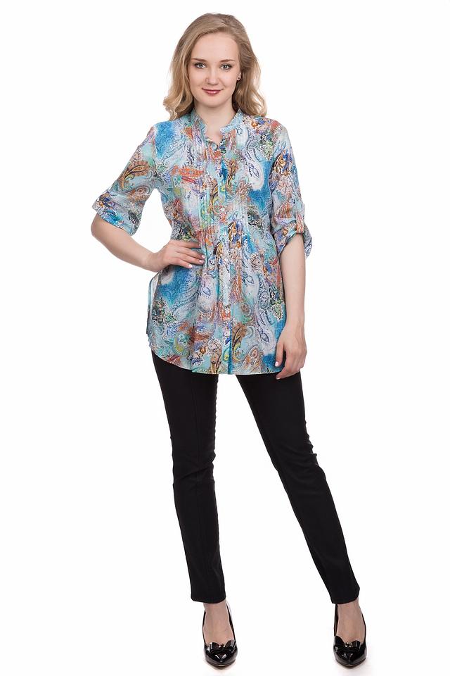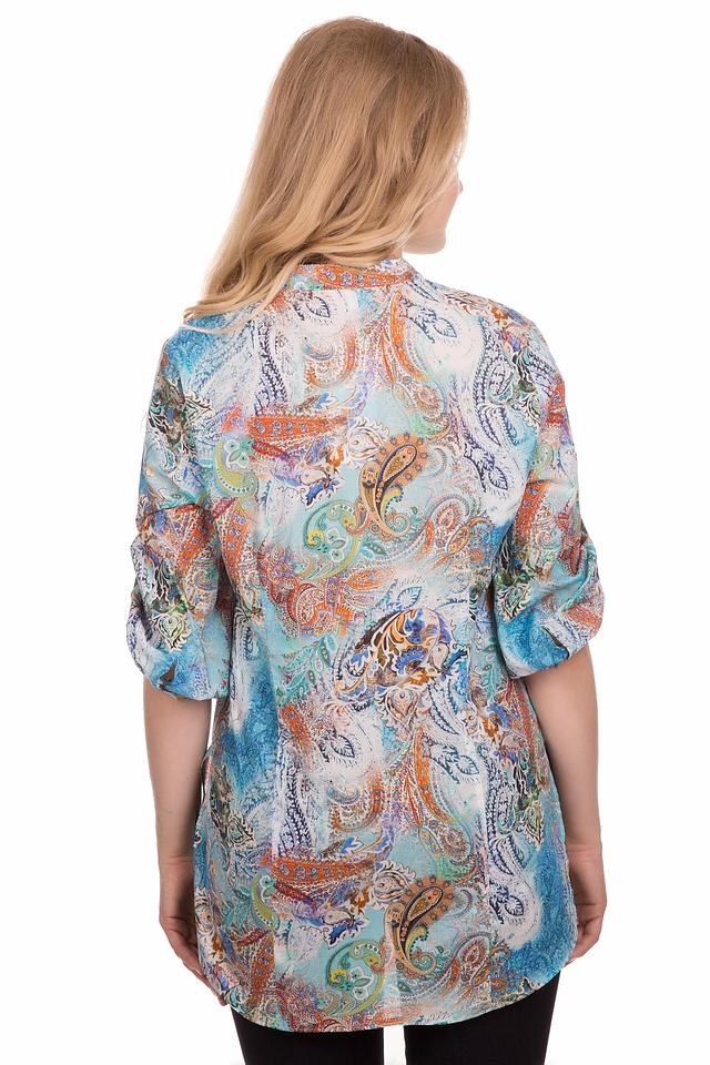 Блуза имеет свободный крой, который не сковывает движений. Особенностью модели является оригинальный принт пейсли, выполненный в сочетании бирюзовых, оранжевых и бежевых оттенков. Воротник-стойка и застежка на пуговицы добавляют блузе элегантности.
