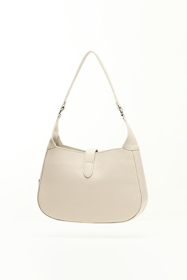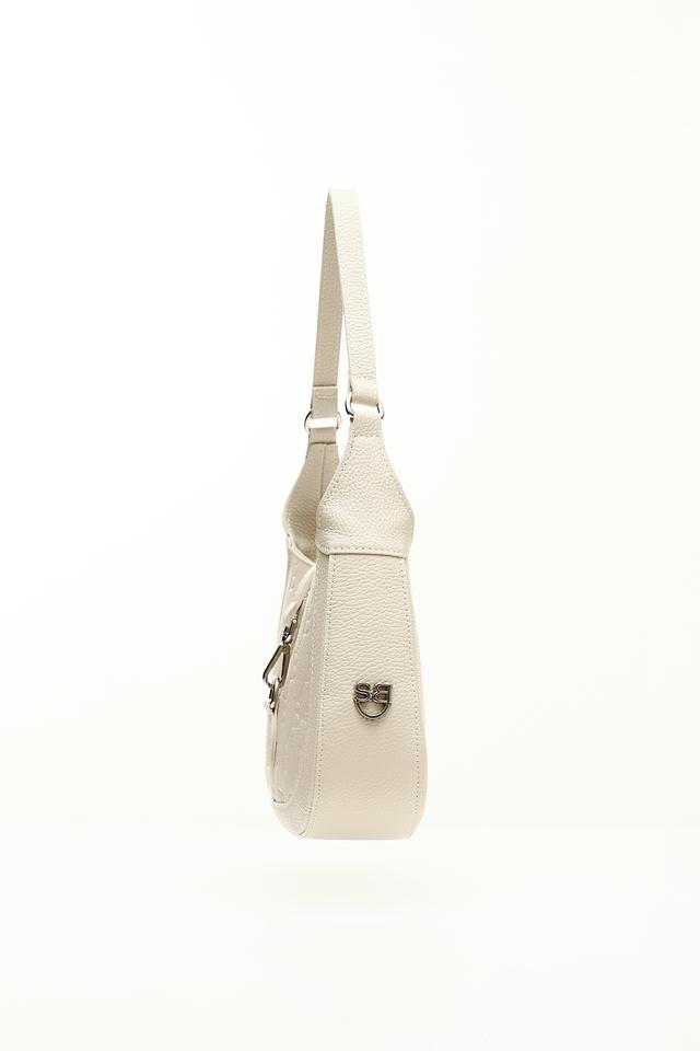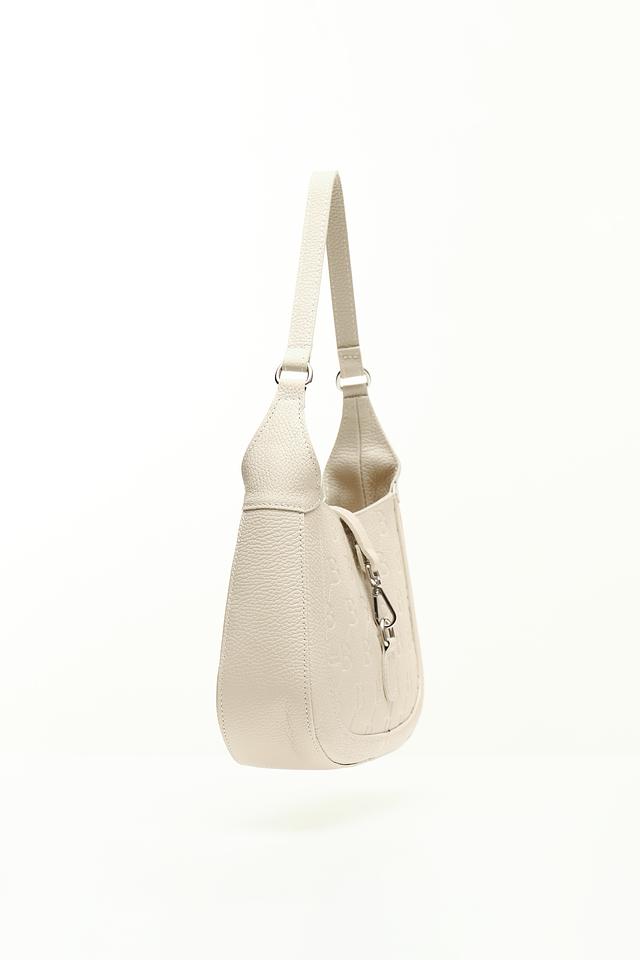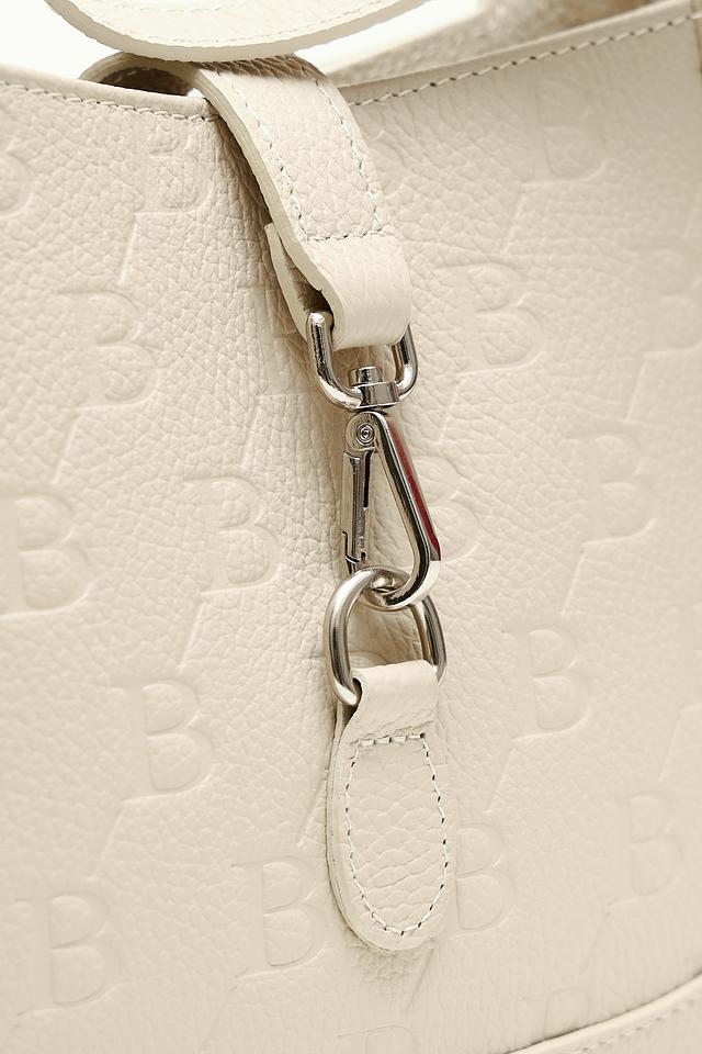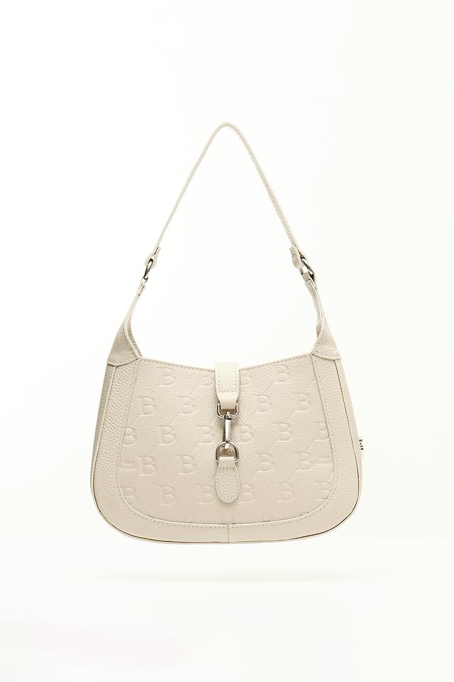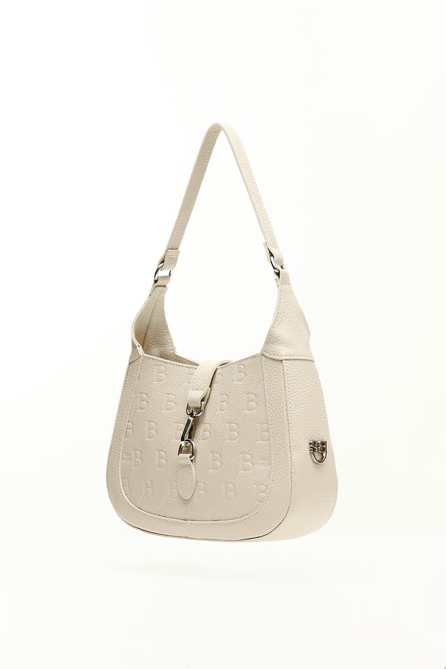 Сумка имеет бежевый цвет и украшена повторяющимся тиснением "BB", придающим ей особый шарм и узнаваемость. Форма сумки – полукруглая, с аккуратными швами и минималистичным дизайном.