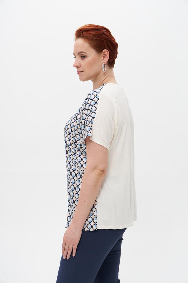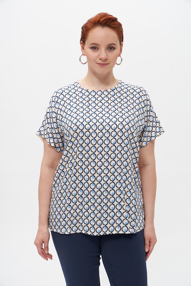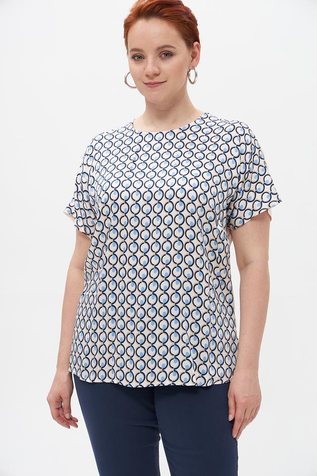 Женская блузка Suza бежевого цвета с ярким геометрическим принтом. Изготовлена из мягкой и приятной к телу вискозы для комфорта в течение дня. Свободный крой и короткий рукав. Состав: вискоза 100%