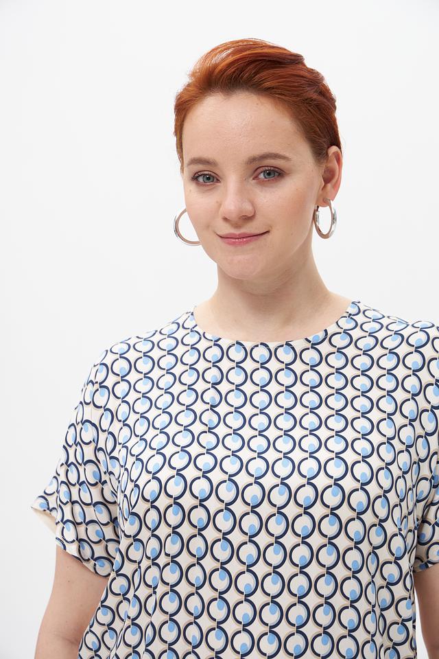 Особенностью модели является яркий геометрический принт, выполненный в голубых и белых тонах на бежевом фоне. Застежка отсутствует, блузка надевается через голову. Спинка оформлена небольшим разрезом.