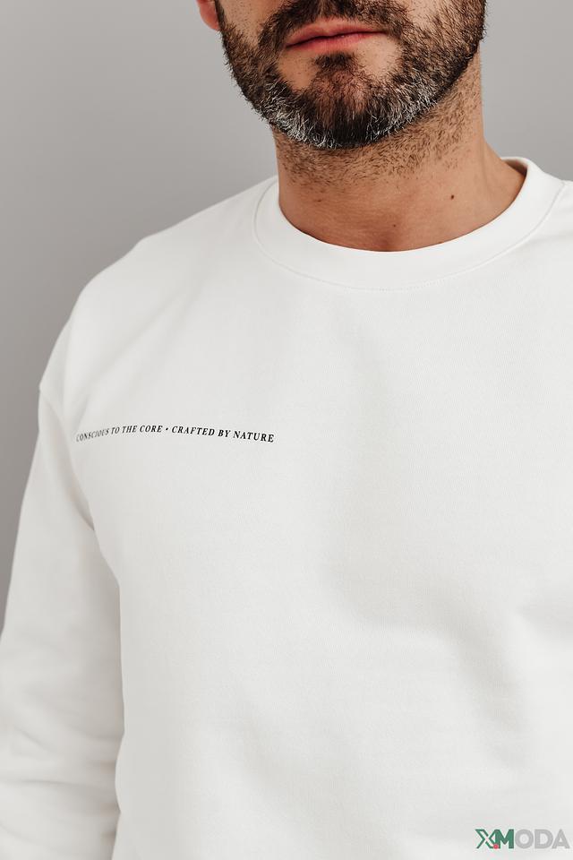 Модель имеет прямой крой, круглый вырез горловины и длинные рукава с манжетами. На груди и спине расположен фирменный логотип бренда, выполненный в контрастном черном цвете, что придает джемперу особый шарм.
