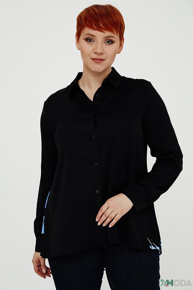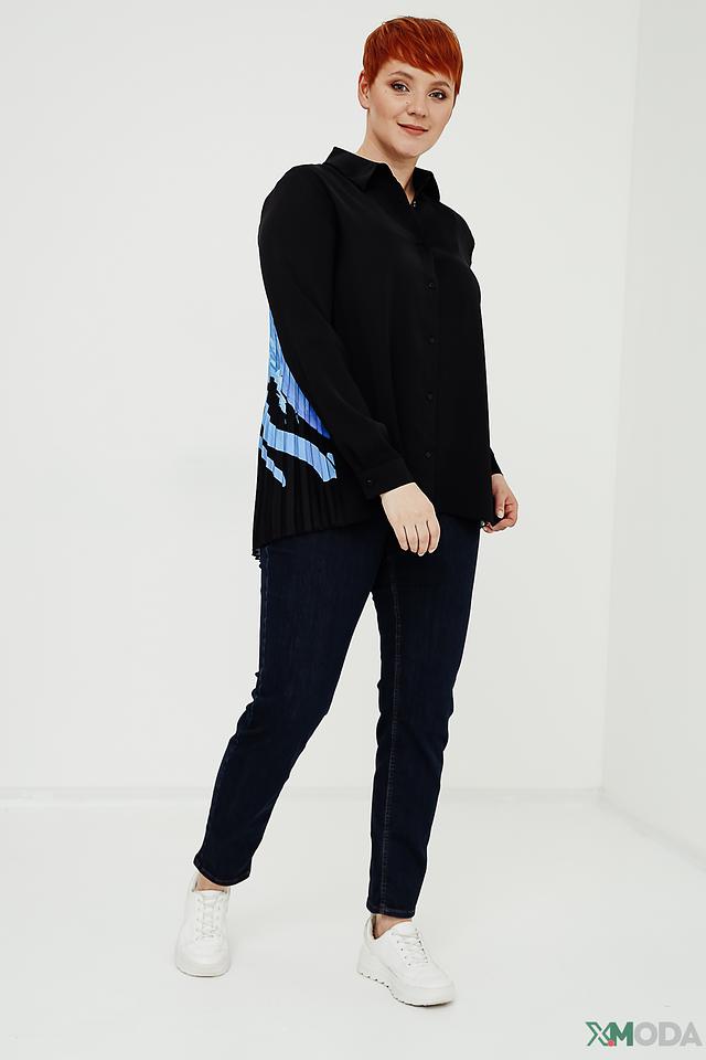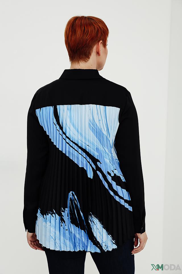 Основной цвет рубашки – чёрный, что делает её универсальной и легко сочетаемой с другими элементами гардероба. Главная особенность – яркий принт на спине, выполненный в голубых тонах с имитацией складок. Этот элемент добавляет образу динамичности и индивидуальности.