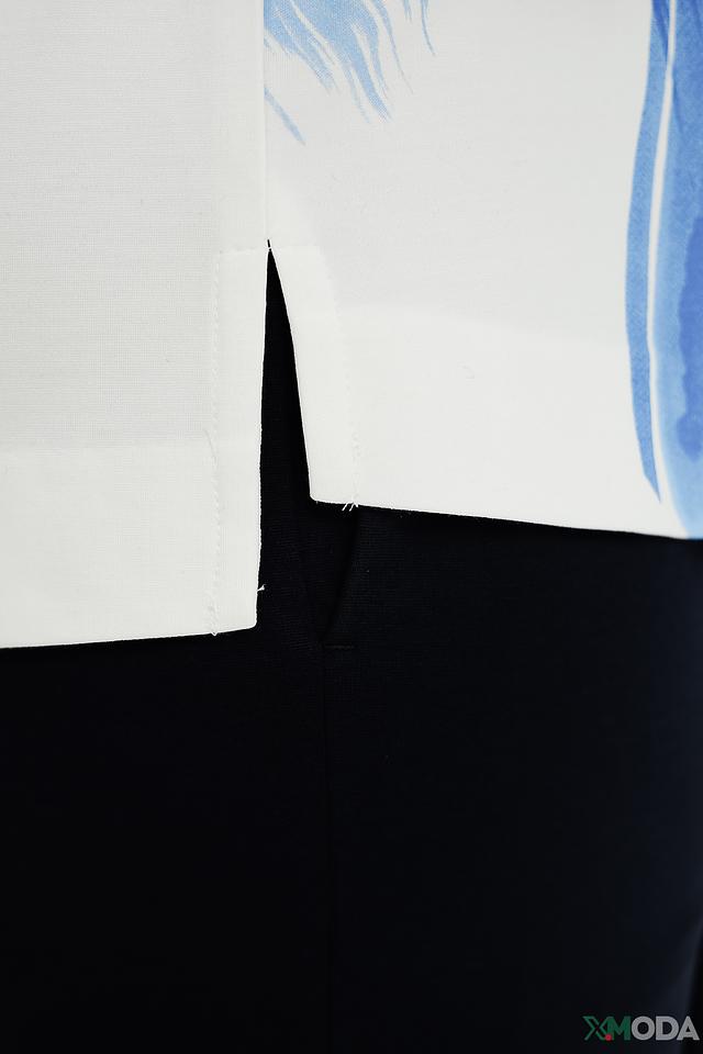 Модель имеет прямой крой и короткие рукава, что обеспечивает свободу движений и комфорт в жаркую погоду. Круглый вырез горловины подчеркивает женственность образа. Футболка изготовлена из высококачественной вискозы (60%), полиамида (35%) и эластана (5%).