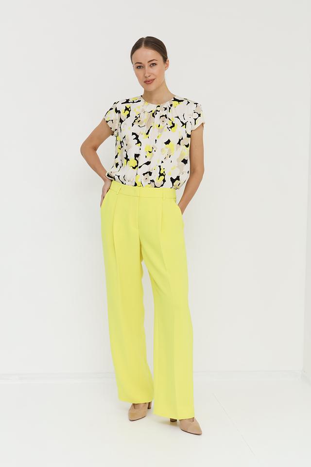 Брюки имеют классический прямой крой и высокую посадку, что обеспечивает комфортную посадку по фигуре и визуально удлиняет ноги. Модель дополнена аккуратными складками спереди, которые придают брюкам более элегантный вид.