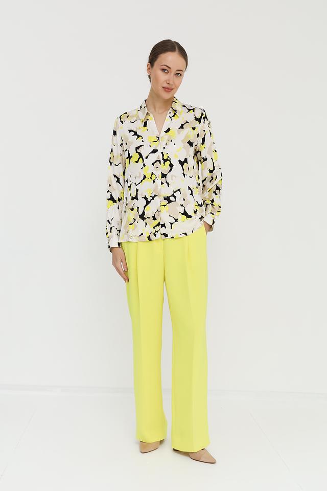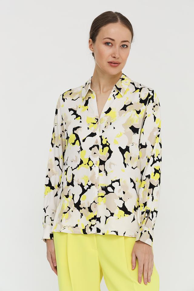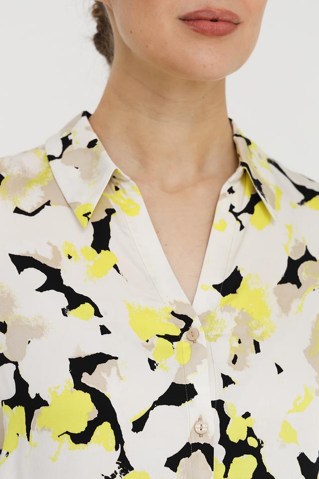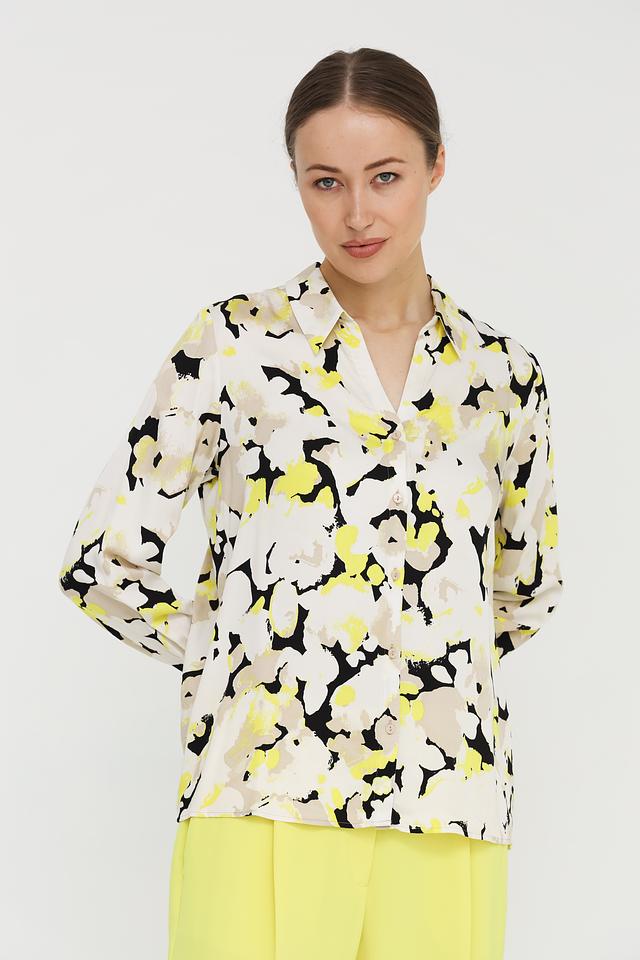 Рубашка имеет классический крой с длинными рукавами и V-образным вырезом. Её украшает яркий и необычный абстрактный принт, сочетающий в себе оттенки жёлтого, серого и чёрного на бежевом фоне. Принт придает рубашке оригинальность и выразительность.