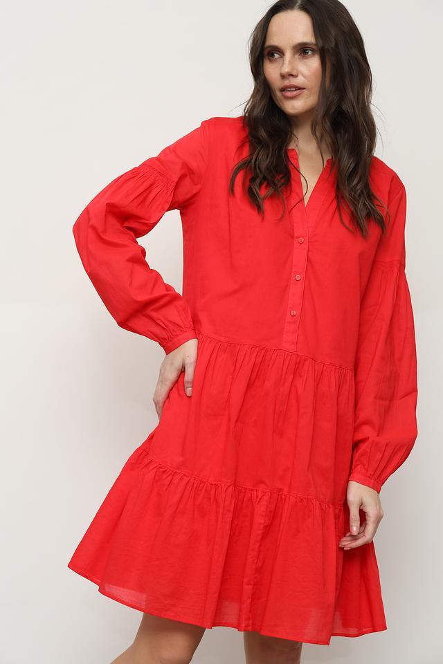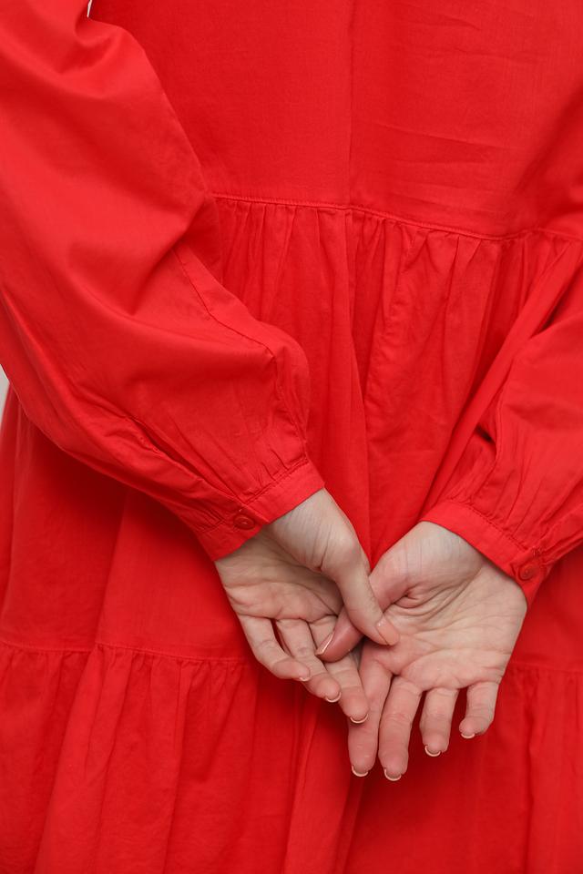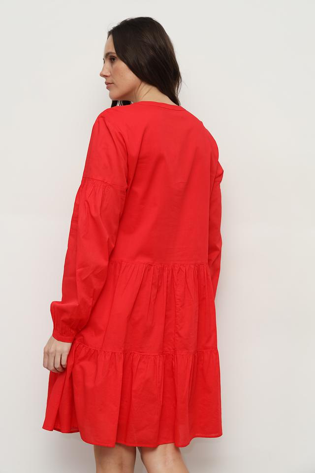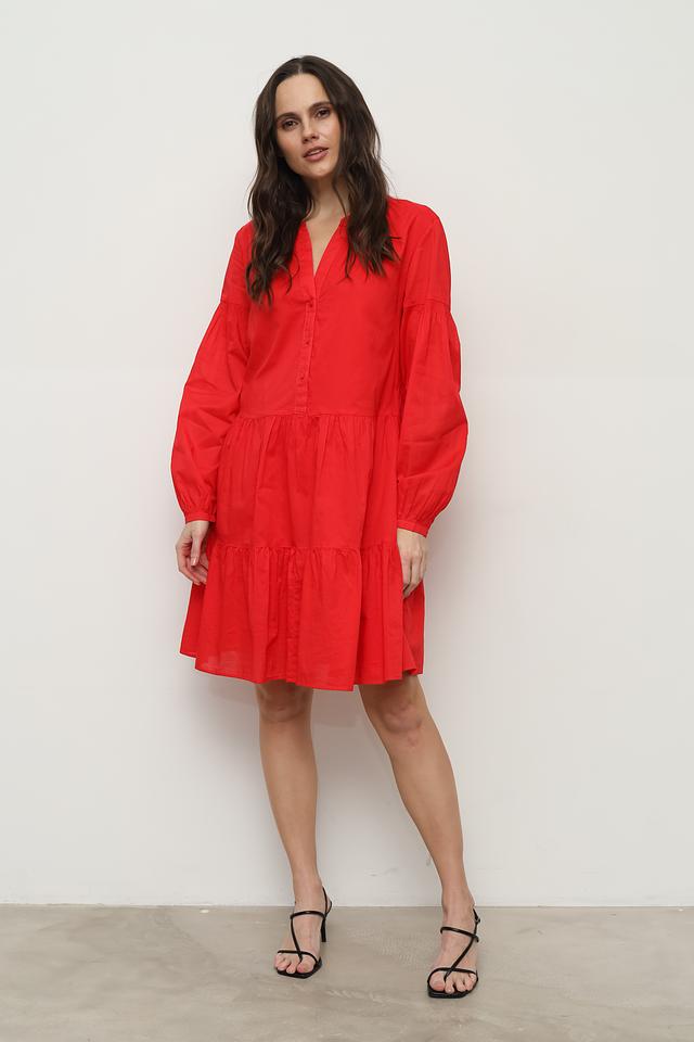 Красное платье от Taifun – это стильное и комфортное решение для повседневного образа. Модель выполнена из 100% органического хлопка, имеет рукава-фонарики и многослойную юбку. Состав: хлопок органич. 100%
