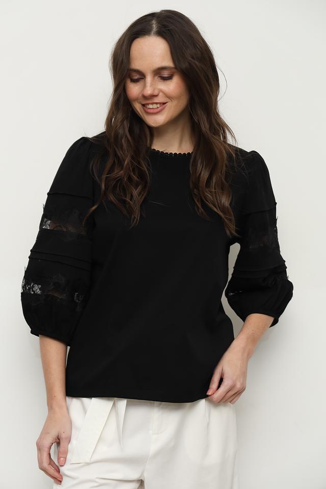 Блуза имеет классический чёрный цвет, который легко сочетается с различными элементами одежды. Рукава выполнены из изящного кружева, что добавляет образу романтичности и изысканности. Округлый вырез горловины и небольшая сборка по плечам создают женственный силуэт.