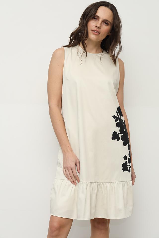 Это платье от Taifun станет отличным дополнением к вашему гардеробу. Выполнено в светло-бежевом цвете с эффектным чёрным цветочным принтом, расположенным асимметрично на передней части изделия.