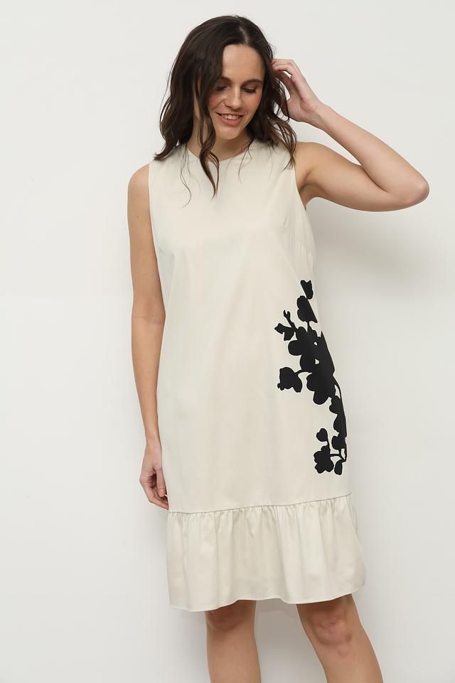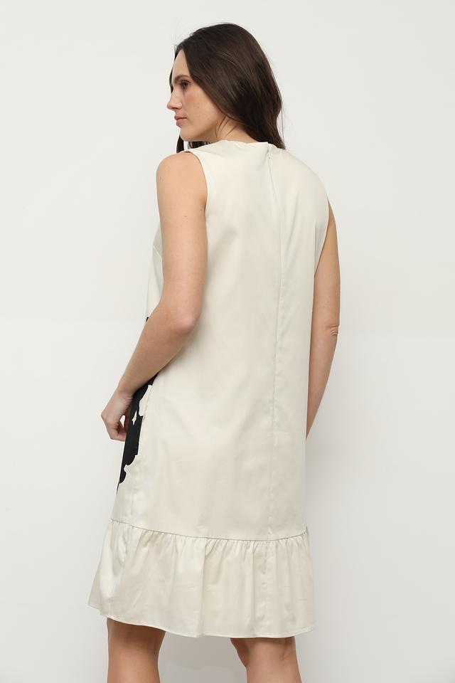 Платье имеет прямой силуэт, длину чуть выше колена и удобный вырез горловины. Отсутствие рукавов делает его идеальным выбором для тёплой погоды. Низ платья дополнен широкой оборкой, придающей образу лёгкость и женственность.