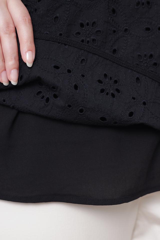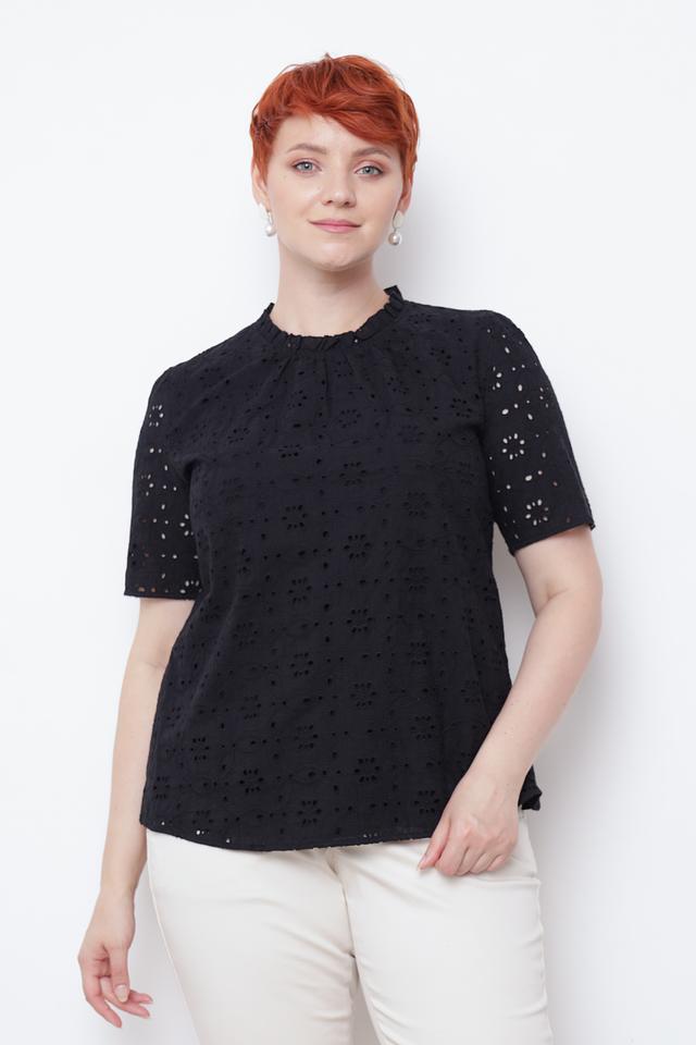 Эта элегантная блуза от Taifun выполнена в классическом чёрном цвете и украшена ажурной вышивкой "ришелье", придающей ей особый шарм.
