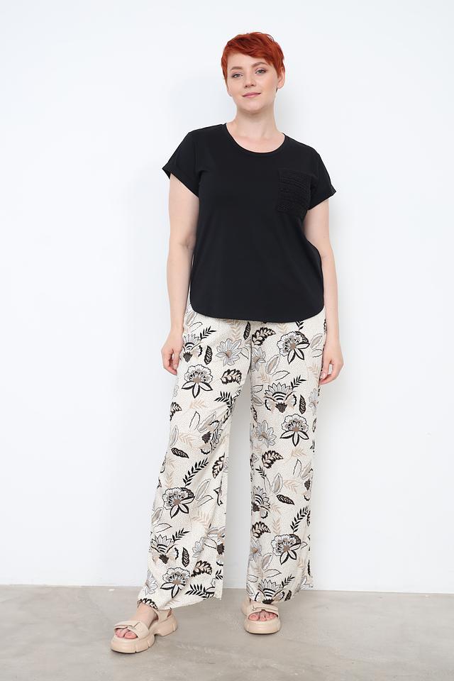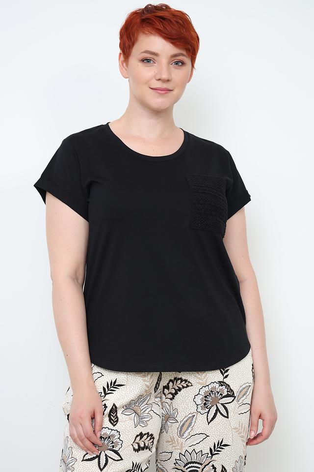 Модель имеет прямой крой, который обеспечивает комфортную посадку по фигуре. Короткий рукав и круглый вырез горловины делают футболку удобной в носке. На груди расположен декоративный карман, выполненный из текстурированной ткани, который добавляет изюминку в дизайн.