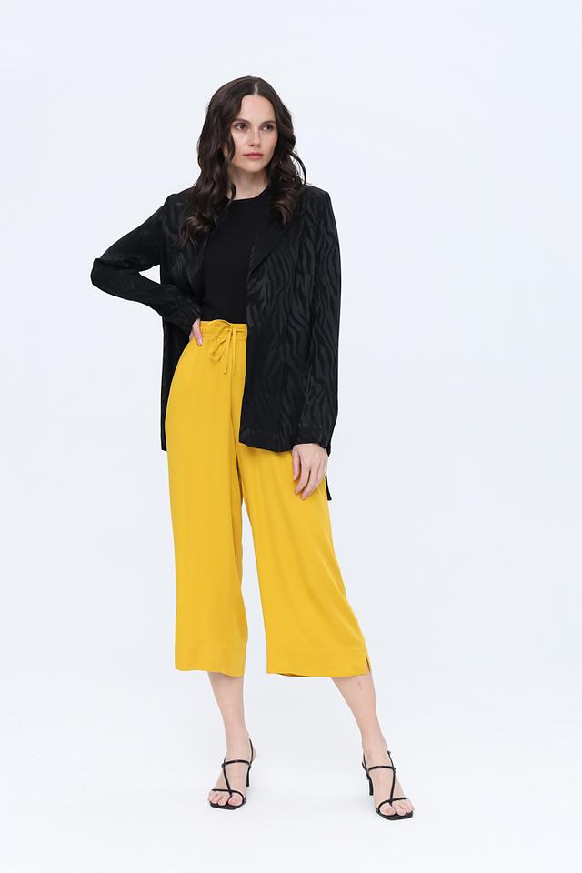 Брюки имеют завышенную талию, которая визуально удлиняет ноги и подчеркивает фигуру. Удобный пояс на завязках позволяет регулировать посадку по фигуре. Кюлоты имеют свободный крой, который не сковывает движений и обеспечивает максимальный комфорт.