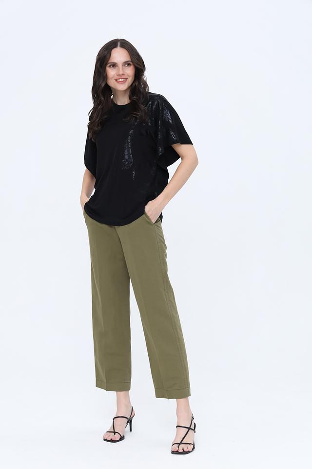 Чёрная футболка от Taifun с оригинальным декором из пайеток. Изготовлена из мягкой вискозы с добавлением эластана для комфорта и свободы движений. Стильный и удобный вариант для повседневного образа. Состав: вискоза 95%, эластан 5%