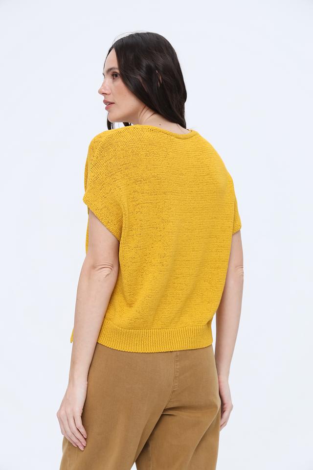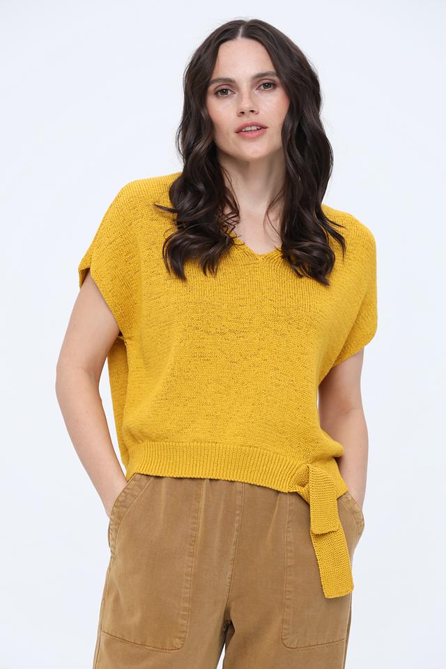 Этот женский пуловер от Taifun выполнен в ярком горчичном цвете и станет отличным дополнением к вашему гардеробу. Модель имеет свободный крой, короткие рукава и V-образный вырез горловины.