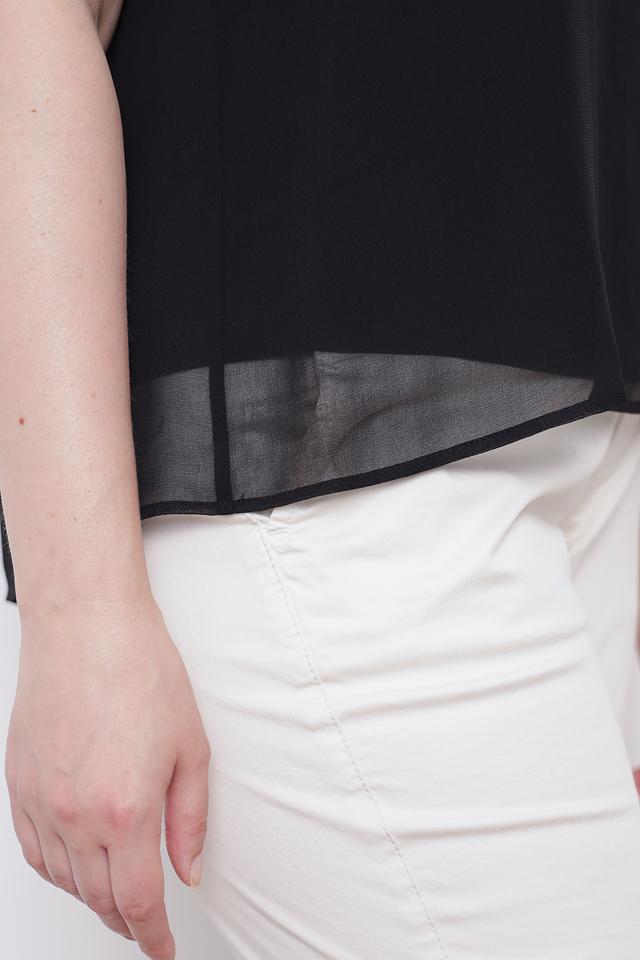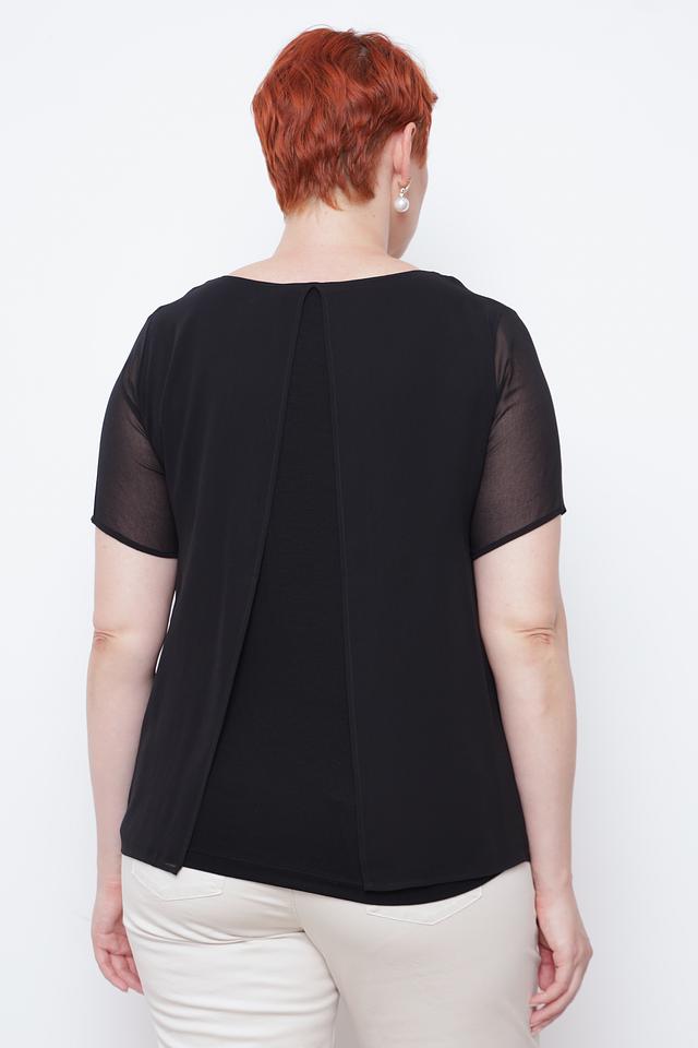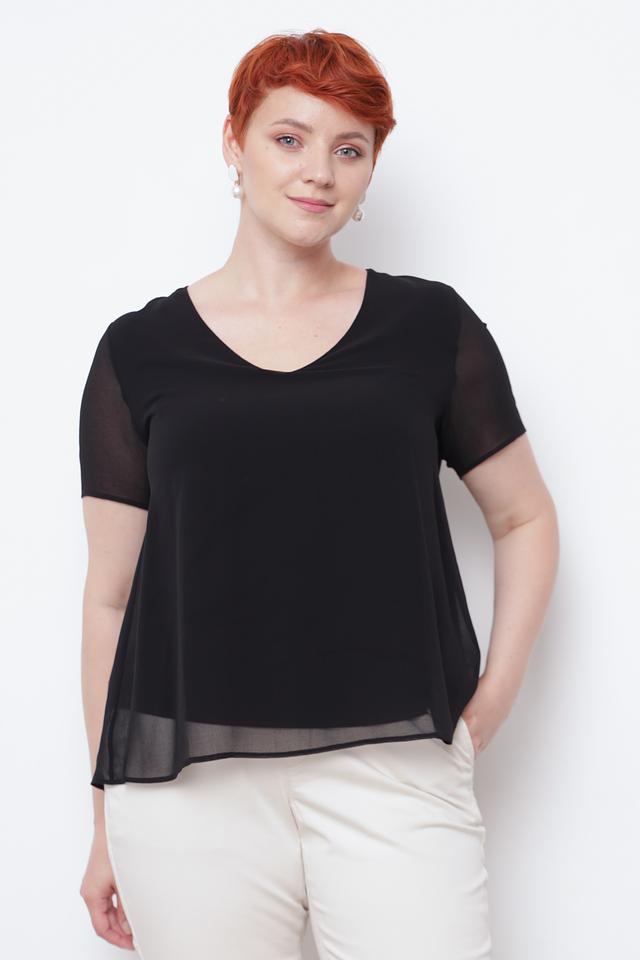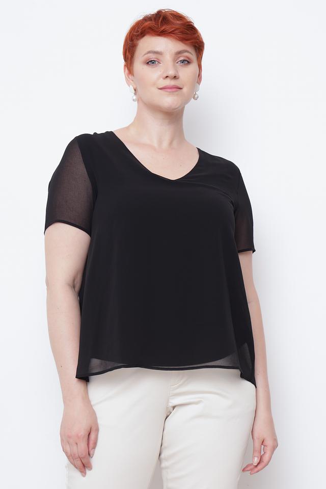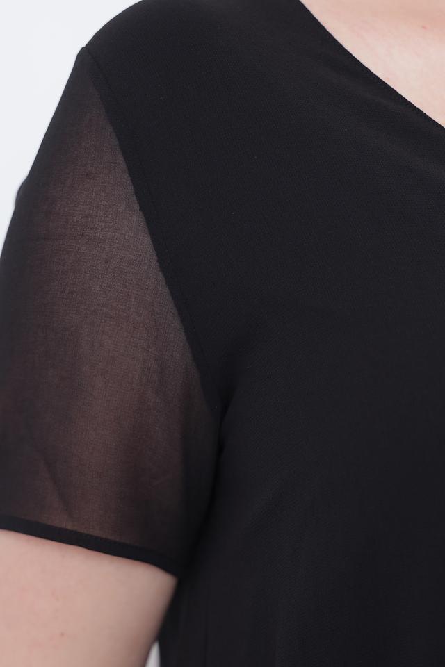 Блуза имеет свободный крой, который не сковывает движений, а V-образный вырез горловины придаёт образу женственность. Короткие рукава выполнены из полупрозрачной сетки, что добавляет модели оригинальности и лёгкости.