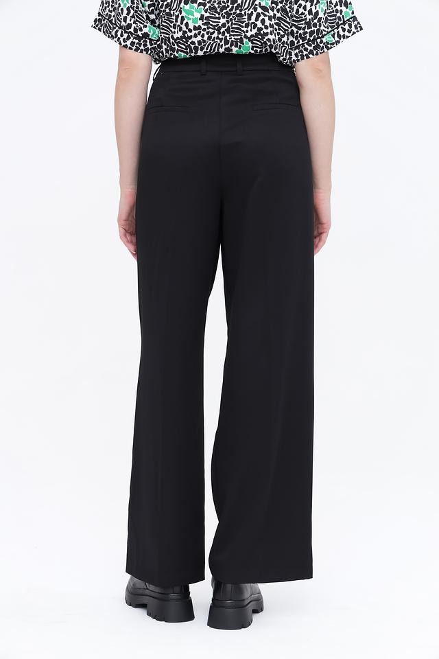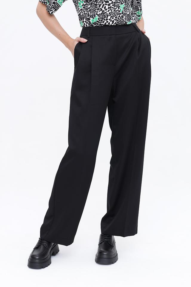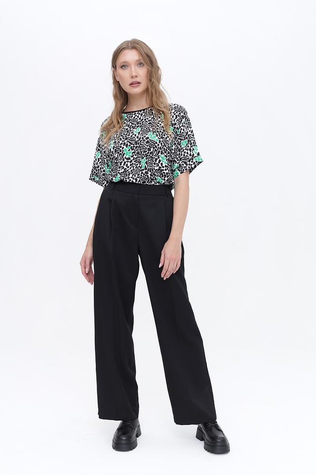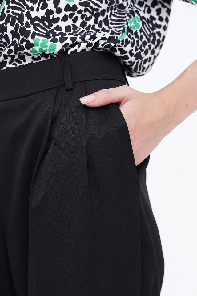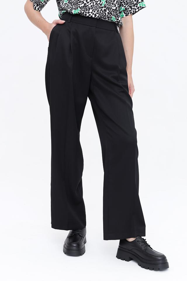 Брюки отличаются прямым кроем и широкими штанинами, что обеспечивает свободу движений и комфорт в течение всего дня. Высокая посадка визуально удлиняет ноги и подчеркивает талию. Наличие боковых карманов добавляет функциональности.