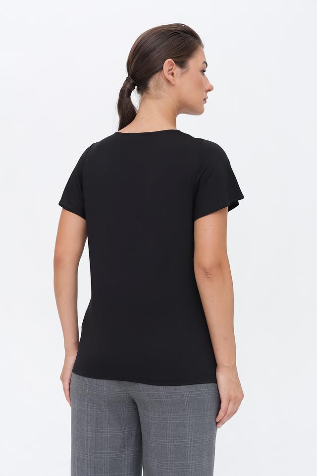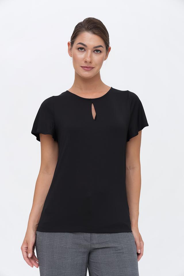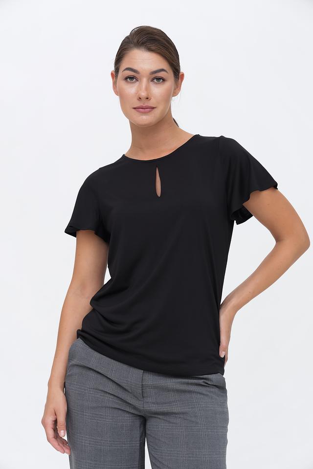 Чёрная блуза Taifun – это элегантная и универсальная модель с небольшим вырезом на горловине и короткими рукавами-воланами. Изготовлена из мягкой и приятной к телу ткани, обеспечивающей комфорт в течение дня. Состав: модал 65%, полиэстер 35%